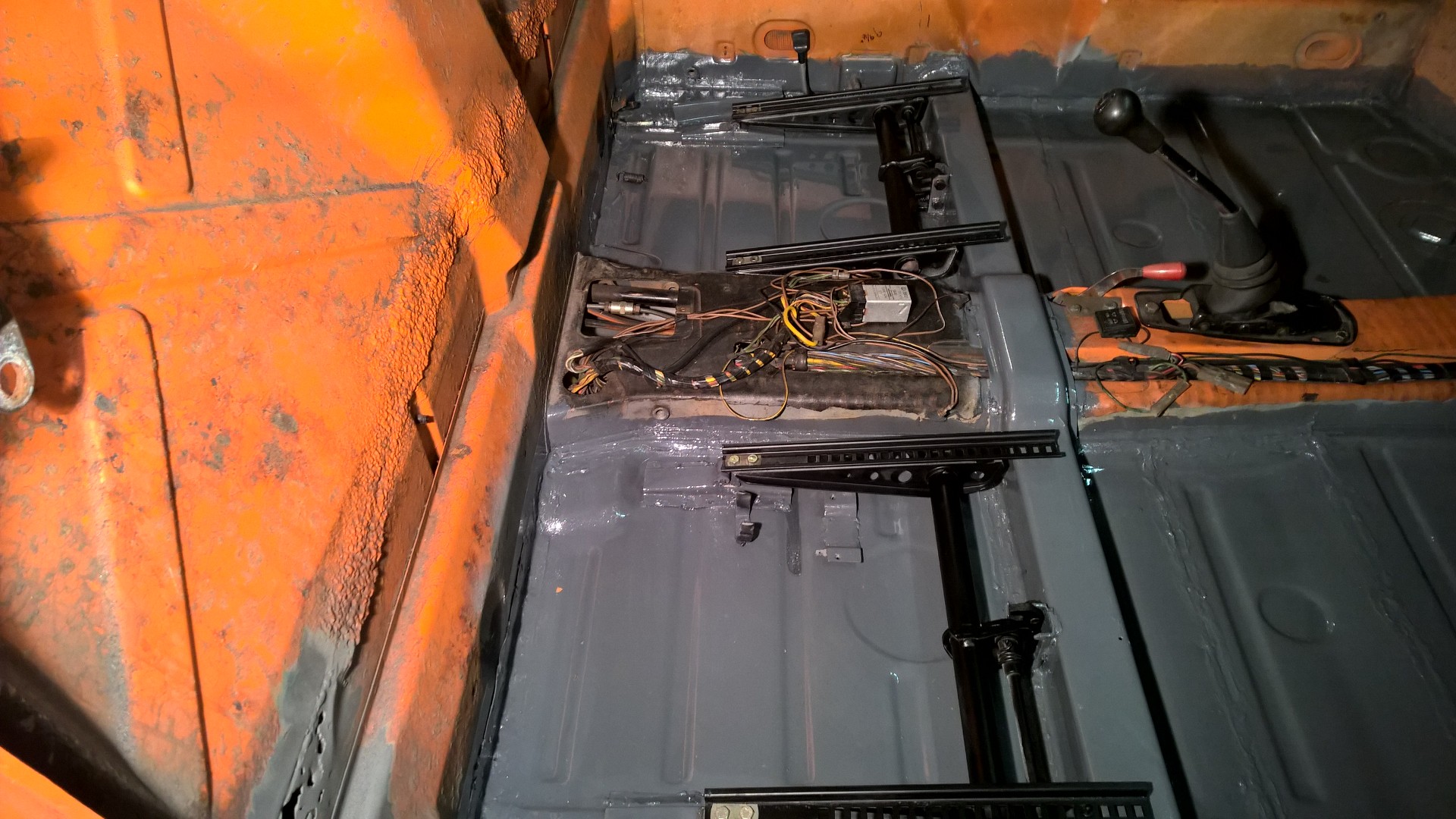 Rebuilt the pedal cluster, POR-15 the new floor pan, painted the seat hardware, and reinstalled. Busy weekend, but now that part of the rust project is done and it's time for Phase II: Pull the motor and fix the hell hole.