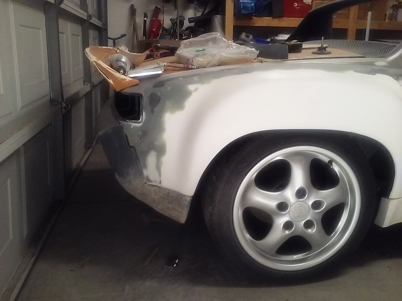 Started glass work on rear bumper shaping it to fit flares. Right now it is a rough fit, hopefully by tomorrow night it will be getting close to done.