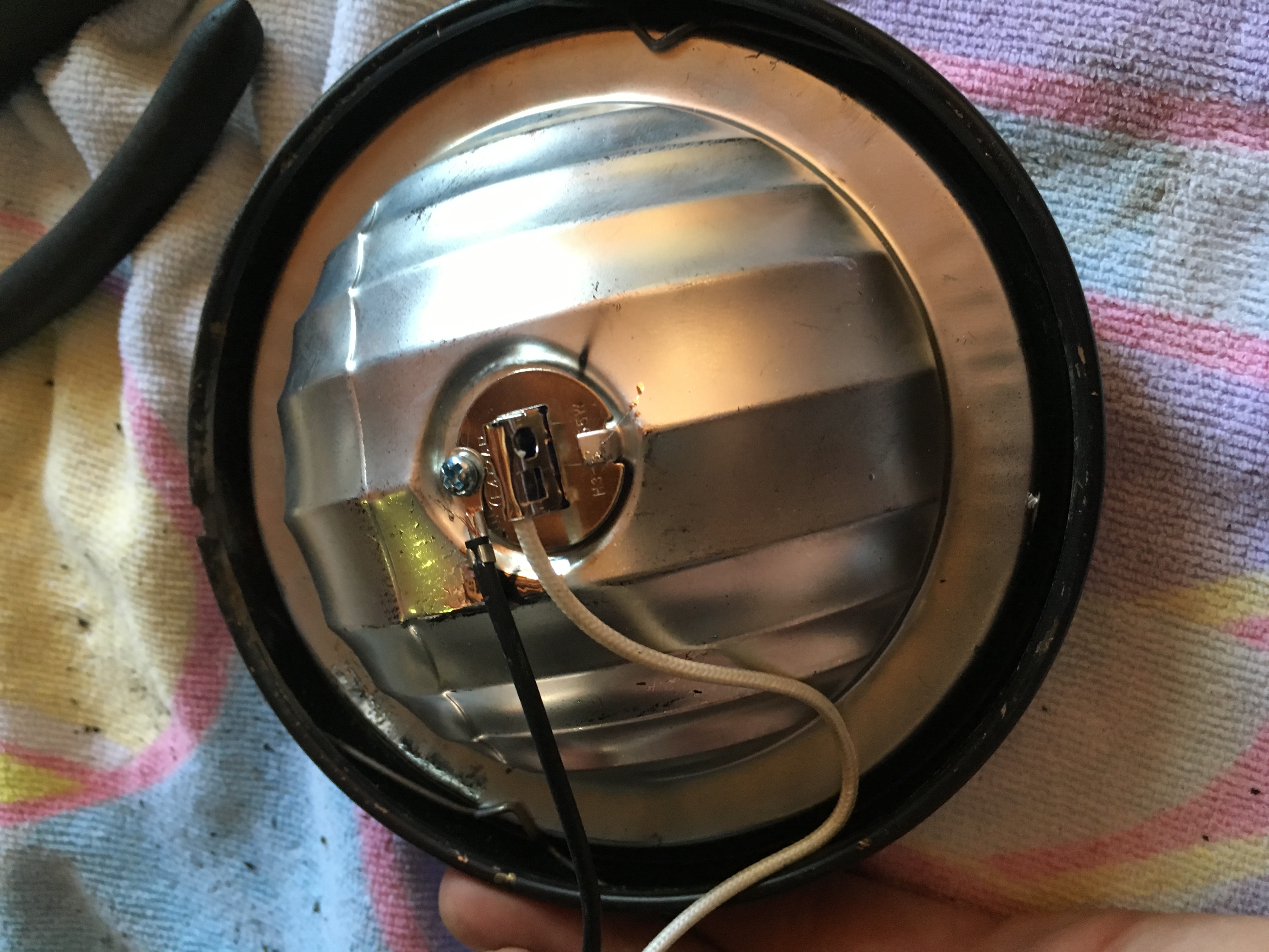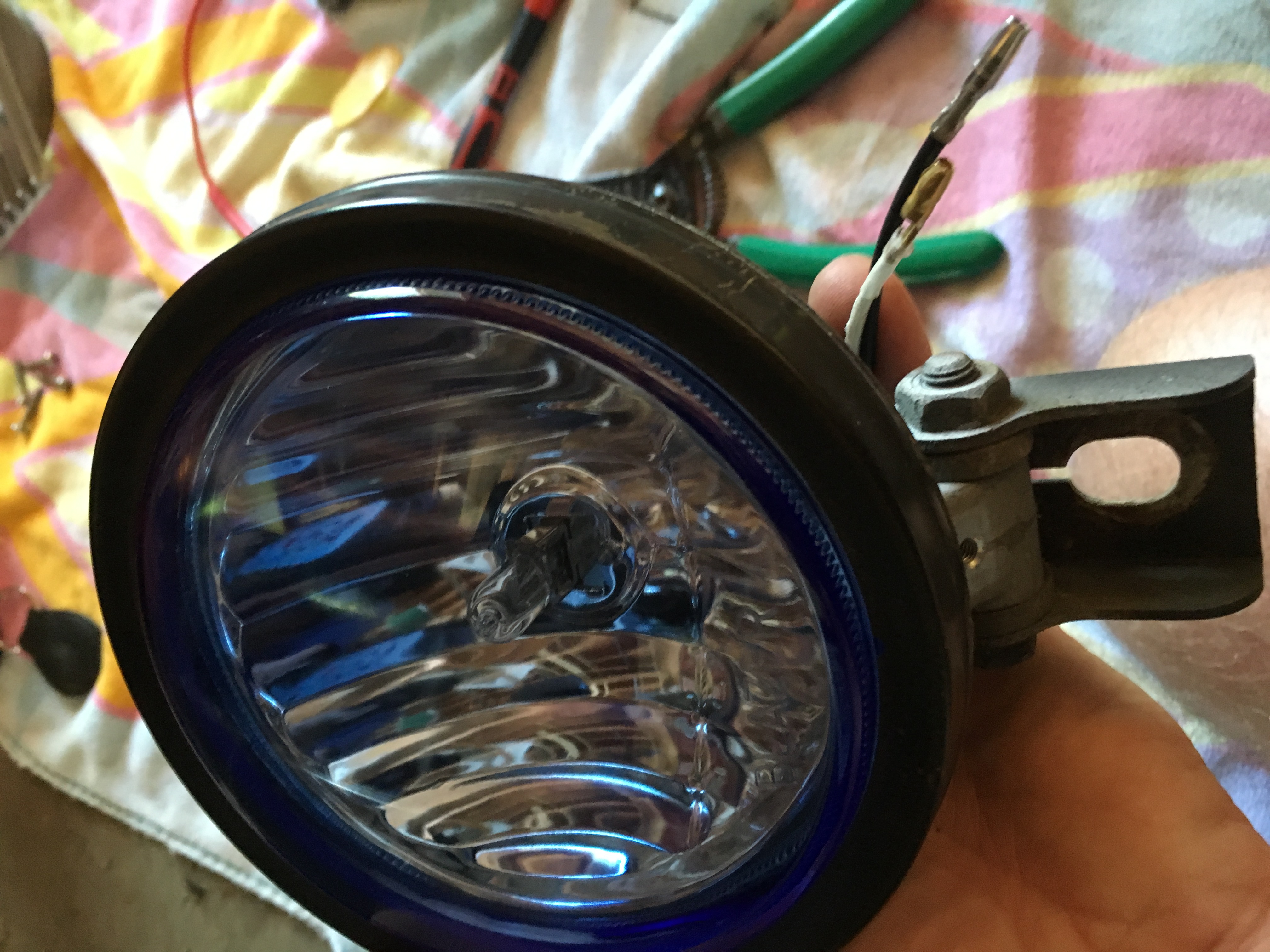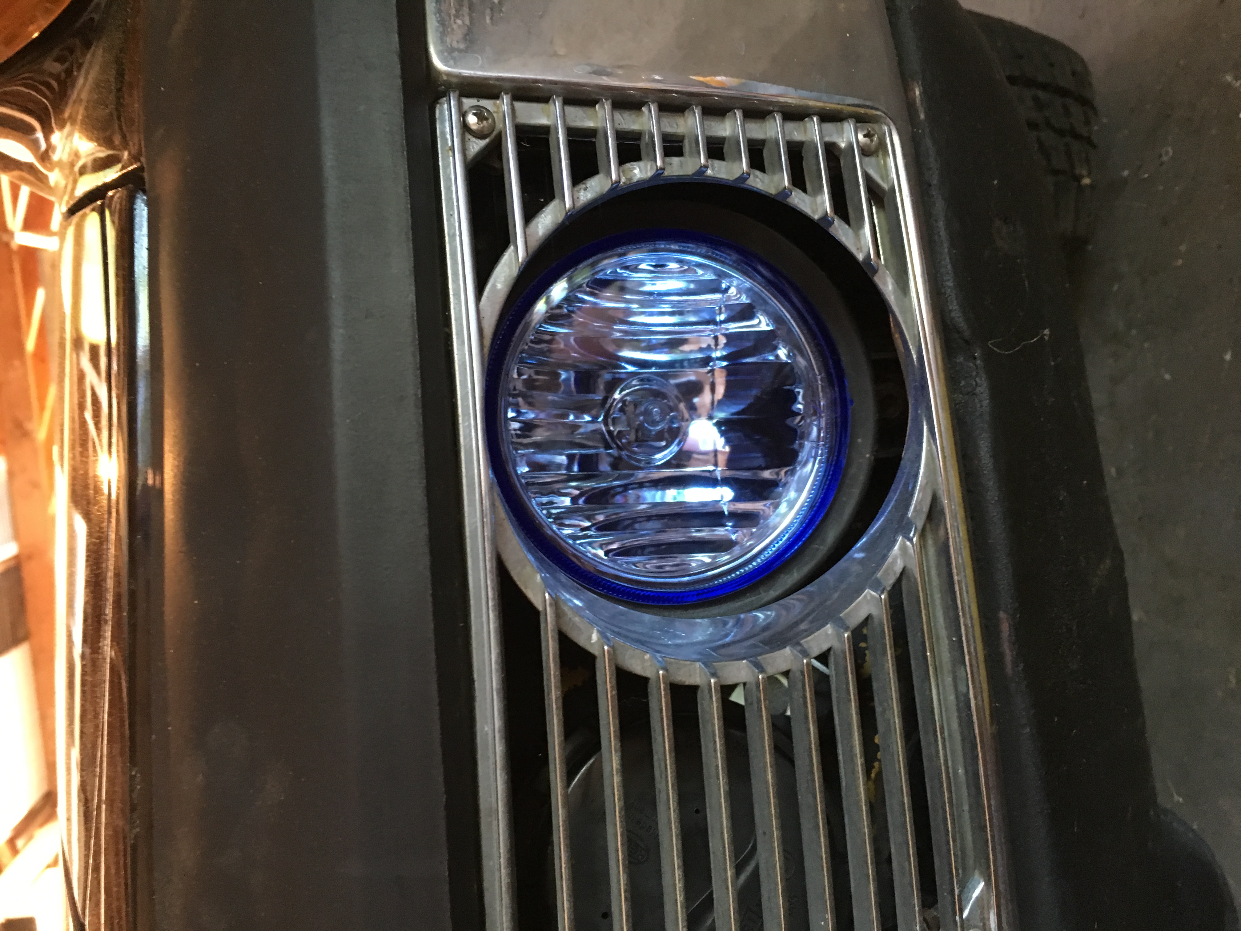 Couldn't find new fog light bulbs... You guys know the F'ing weird tab ones..... So check out this mod!! first I went to the Autozone (don't laugh) and got a set of Blaze driving lights for 30 bucks!! They are the N3619 light set. They are 4 inch lights that come with a crazy mounting set up but that's not important. What is important is that when the new lights are taken apart the bulb housing assembly is the exact dimensions as the factory hella light. Simply remove the mount ring holding the old lens assembly, pop out the wire holding snap things. Now take the new light assembly and install in the ring! Ok on to the old housing loosen the set screw holding the white wire and the ground wire. Cut the spade connector off the ground wire and pull the old wires through. Now the whole assembly can be put back together with your new bulb assembly. Connect the white to white and black to brown. Remount your fog assemblies and reinstall the grills. Done 30 bucks 1 hour and you now have halogen white light fog/driving lights!!