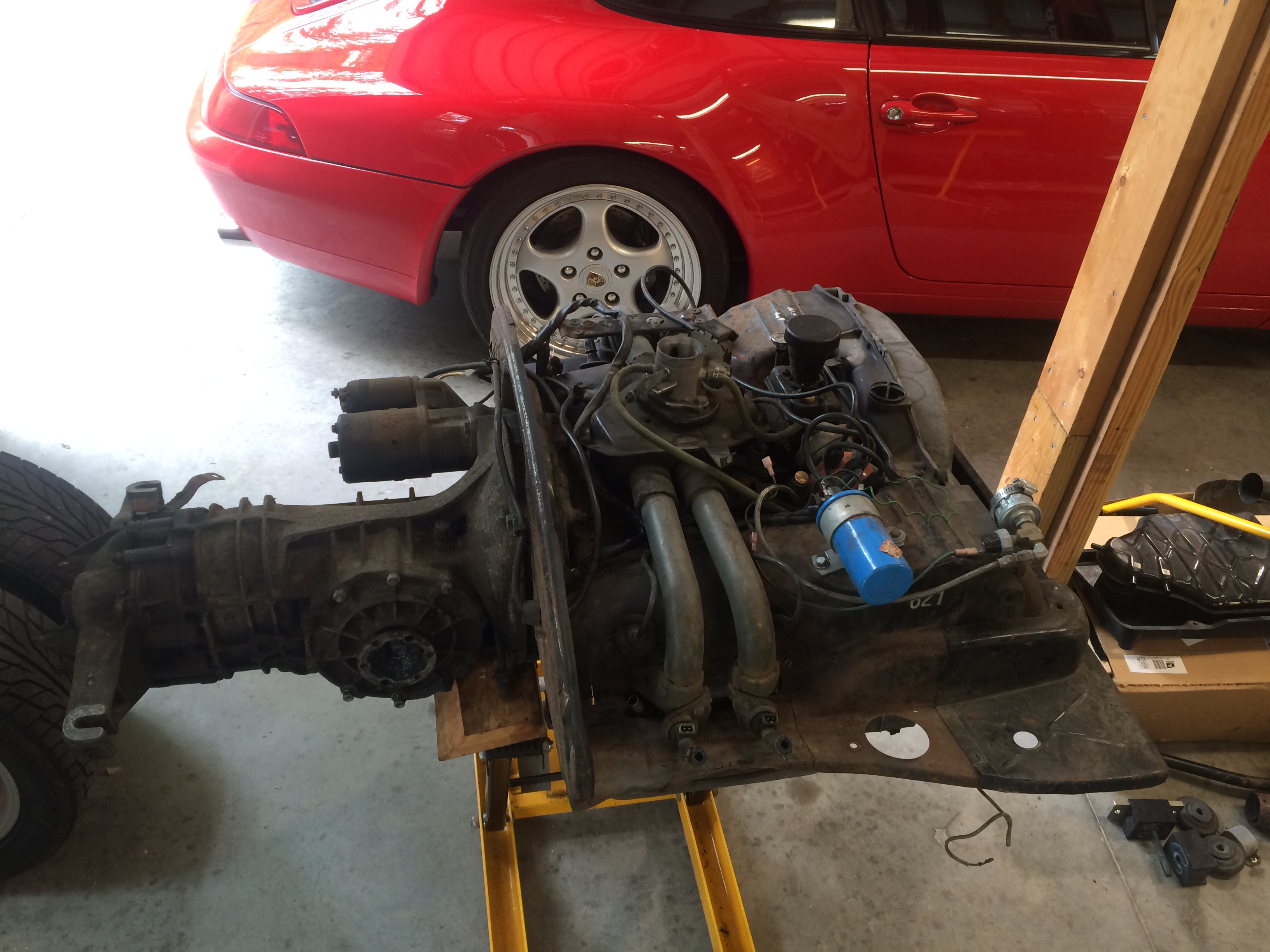 Meanwhile, I installed an early 911 type throttle lever and the linkage/shaft in the front tunnel and adjusted it. The carpet will be replaced. Getting the car prepped for welding in the front six mount and oil tank install. |