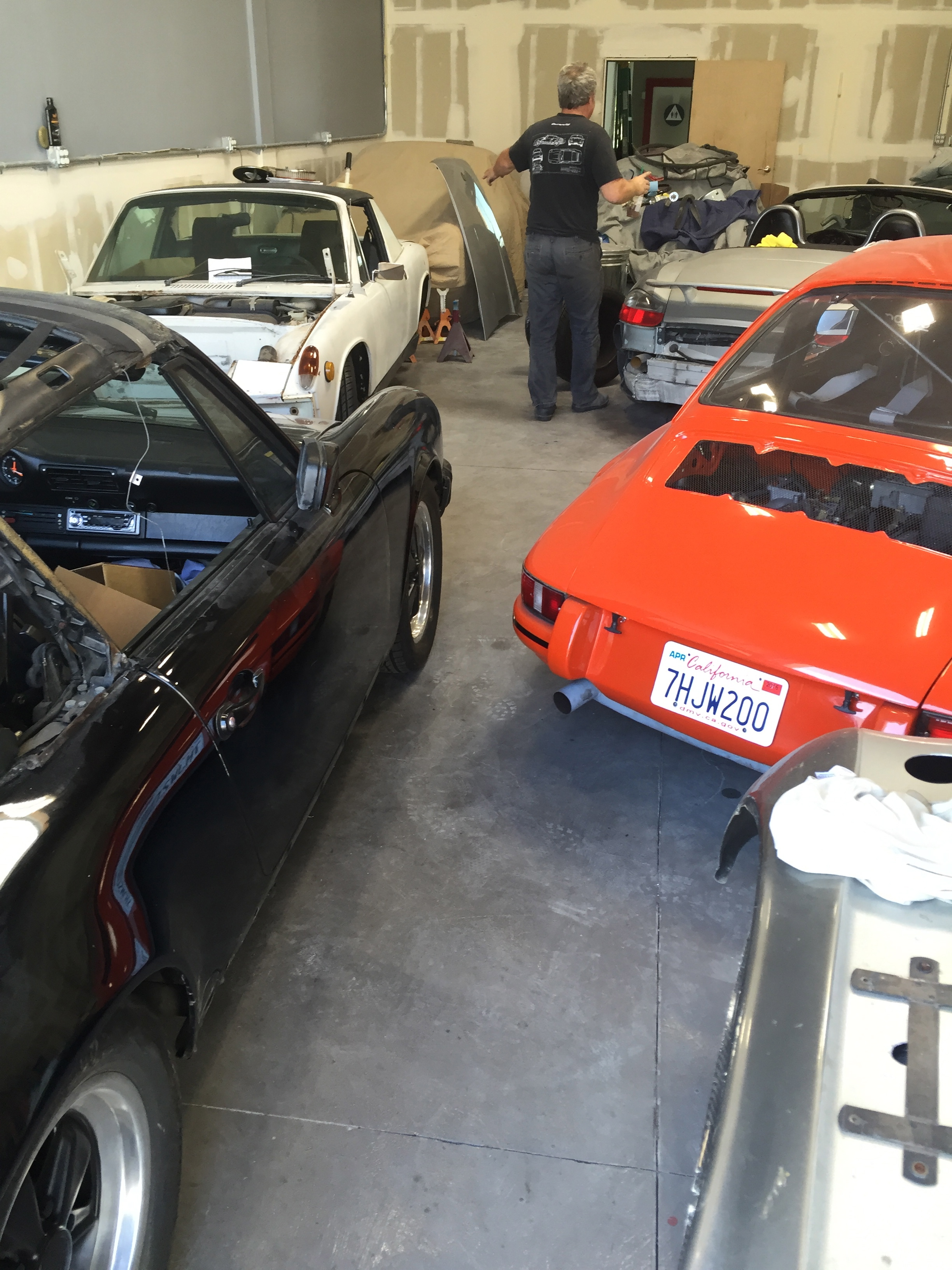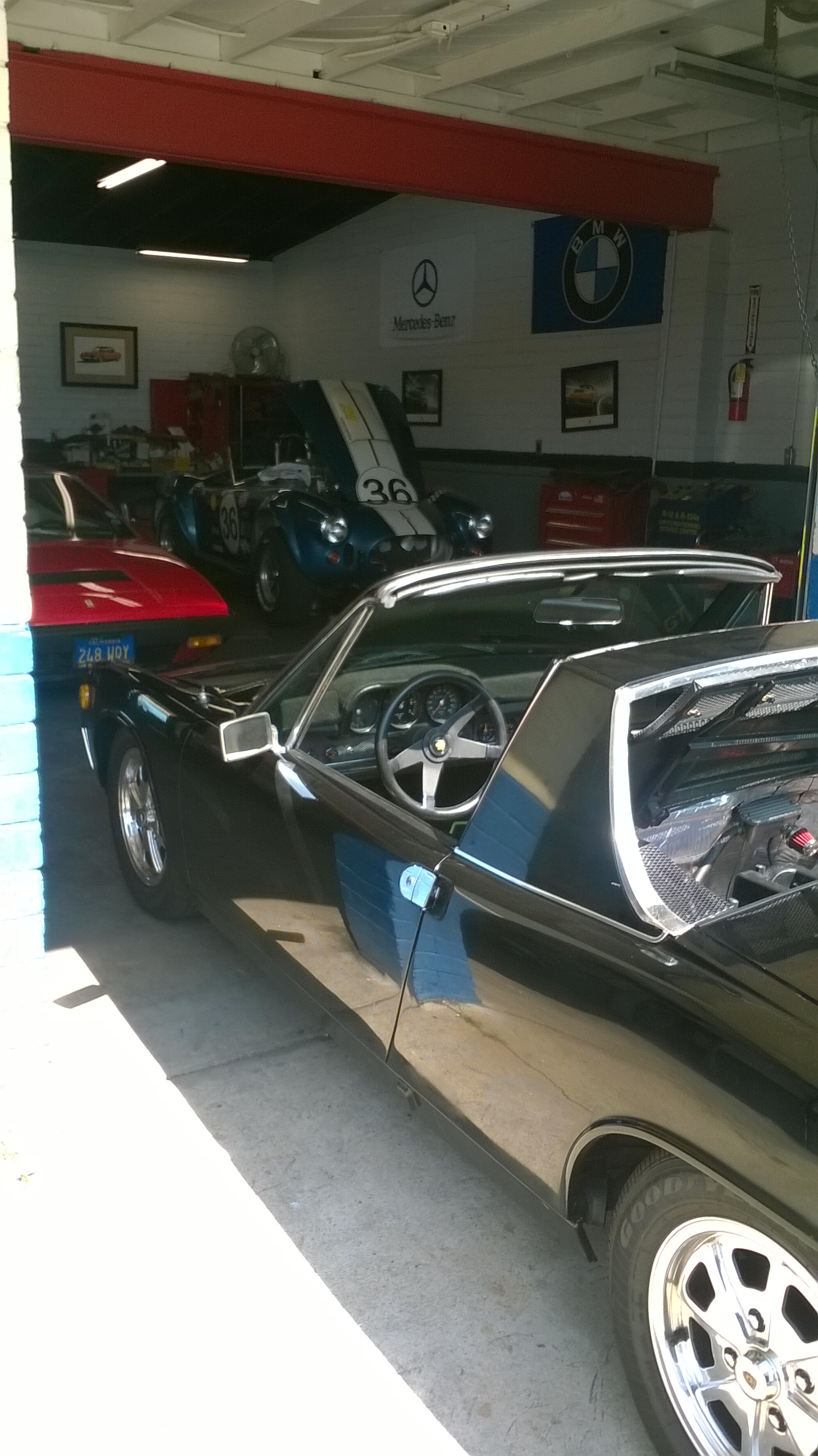 So dropped by my friends shop (local friendly Porsche guy) to run a compression test. Unfortunately it was being used on the Cobra. He's got a broken piston but mine is still a puzzle to be solved. ...painting on the wall is a 914. He's got a Boxster engine sitting around that he wants to put in my car...I keep telling him it won't fit...gotta get the 4 running smooth again. (IMG:style_emoticons/default/biggrin.gif) |