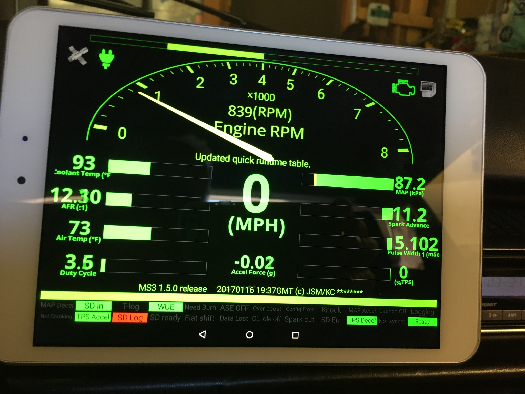 Getting my car ready for WCR. Last year I had installed 5 gauges in my center console but I didn't like the "busy" look of that many gauges. A couple of months ago I had the vinyl sides of the console recovered and that gave my the impetus to do something about the gauge issue. I decided to use a 964 oil pressure & temp combo gauge and an older 911 pressure & temp gauge. The 964 gauge was easy, it just required an appropriate 911 oil temp sender. The 914 oil pressure sender works directly for oil pressure. This is the upper combo gauge in my console. This gauge also has a number of indicator lights that will implement later show various fault conditions. I wanted the lower gauge to display CHT and AFR values. First I disassembled the gauge, and scanned the gauge faces. I then used Photoshop to create new gauge faces to show Cylinder Head Temperature and on the second gauge Air/Fuel Ratio. My Megasquirt uses these sensors for its fuel calculations so I used Megasquirt's CAN Bus output to send these values to an Arduino computer that then transforms the CHT and AFR to voltage values that are output to the gauges. Also, since you can't have too much information, I made a mount that replaces the ash tray so that I can have an Android tablet on my dash. In the display shown below it is using a product called Shadow Dash MS to communicate via Bluetooth to the Megasquirt ECU. The tablet can also be used as a navigation computer. The tablet is fully readable in normal sunlight driving conditions. that might be the coolest techie mods/upgrades for 914's yet! watch out when you display such cool mad skills, you may end up in a business creating such things for others that like but dont have the same ability to create ourselves- its happened before- (IMG:style_emoticons/default/beerchug.gif) what is it you do may i ask? automotive computer engineer? Semi-retired from various high tech positions. Software development, engineering management for electro-mechanical and laser optical devices. |