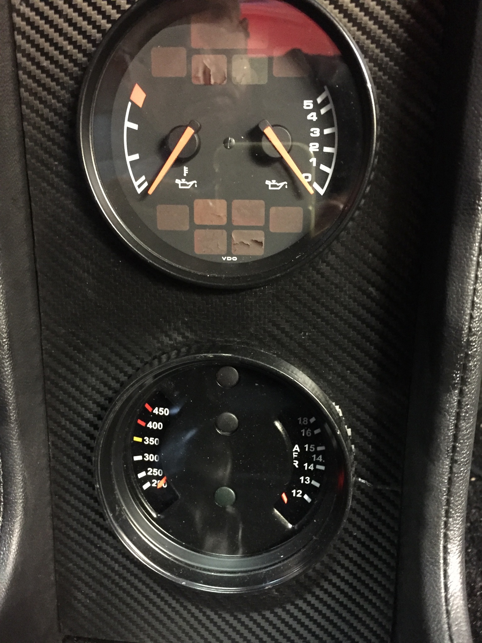 I decided to use a 964 oil pressure & temp combo gauge and an older 911 pressure & temp gauge. The 964 gauge was easy, it just required an appropriate 911 oil temp sender. The 914 oil pressure sender works directly for oil pressure. This is the upper combo gauge in my console. This gauge also has a number of indicator lights that will implement later show various fault conditions. I wanted the lower gauge to display CHT and AFR values. First I disassembled the gauge, and scanned the gauge faces. I then used Photoshop to create new gauge faces to show Cylinder Head Temperature and on the second gauge Air/Fuel Ratio. My Megasquirt uses these sensors for its fuel calculations so I used Megasquirt's CAN Bus output to send these values to an Arduino computer that then transforms the CHT and AFR to voltage values that are output to the gauges. Also, since you can't have too much information, I made a mount that replaces the ash tray so that I can have an Android tablet on my dash. In the display shown below it is using a product called Shadow Dash MS to communicate via Bluetooth to the Megasquirt ECU. The tablet can also be used as a navigation computer. The tablet is fully readable in normal sunlight driving conditions. Attached thumbnail(s) |