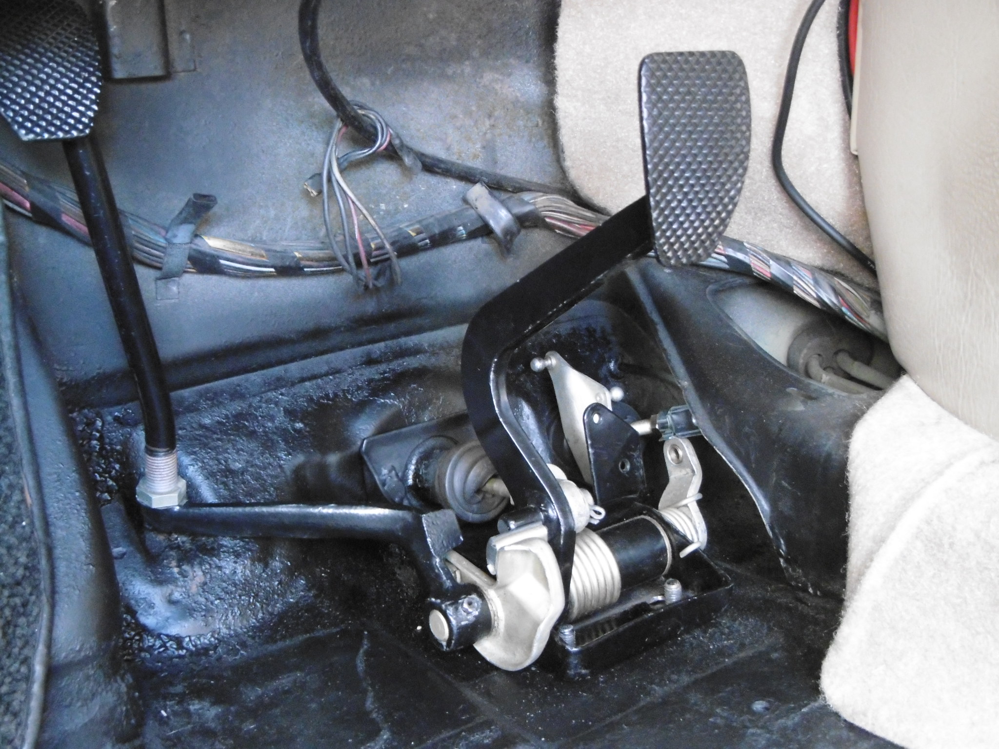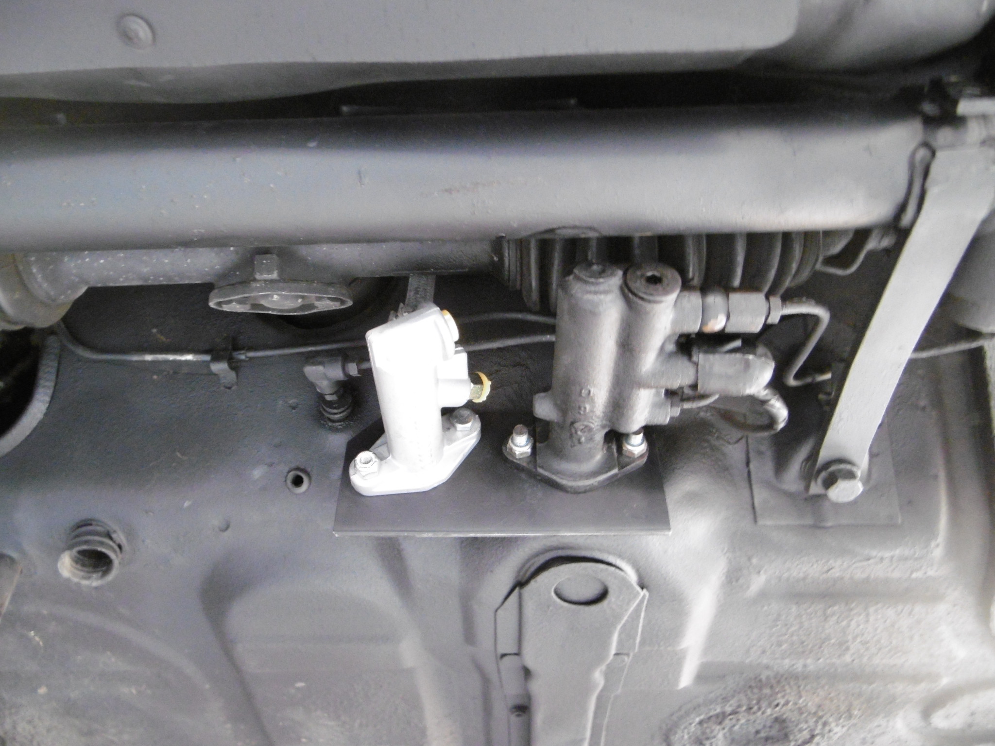 Gave the pedal area of the floor a fresh coat of flat black after spraying the primer spray a few days ago. Changed out the bushing in the modified pedal assembly to accept the 5/16" dia pin on the new clevis that threads into the Willwood M/C's rod. Partially installed the pedal assembly - enough to get the steel plate to sandwich between the floor board and the brake M/C ... what a pain in the ass that was with no help (IMG:style_emoticons/default/dry.gif) ... and back underneath to tighten things up I highly recommend having a helper ... would have made this a little more enjoyable and took a lot less time. Next up, running the braided hydraulic hose through the tunnel back to where the slave cylinder will be mounted and mount the slave on the tranny ... |