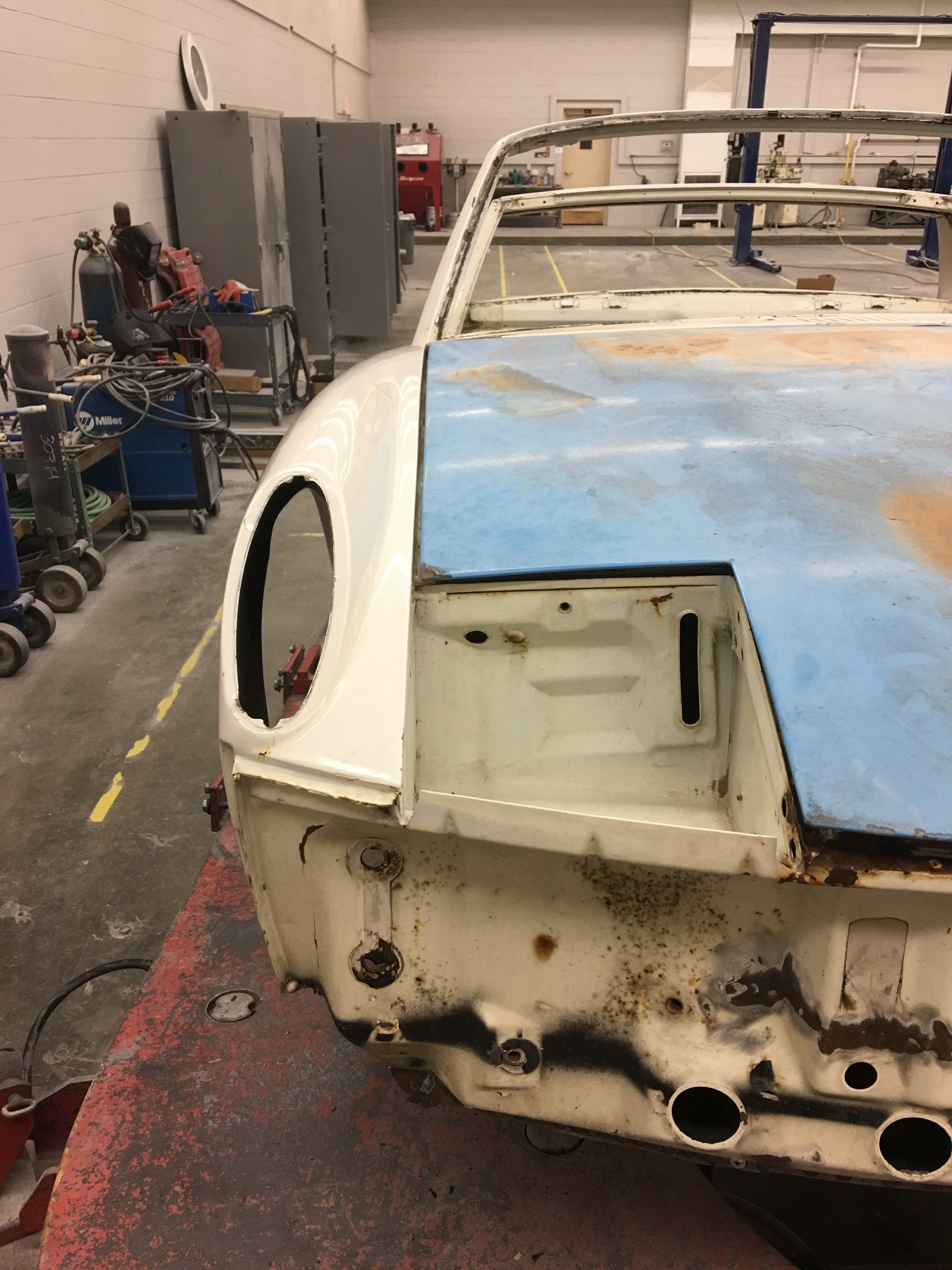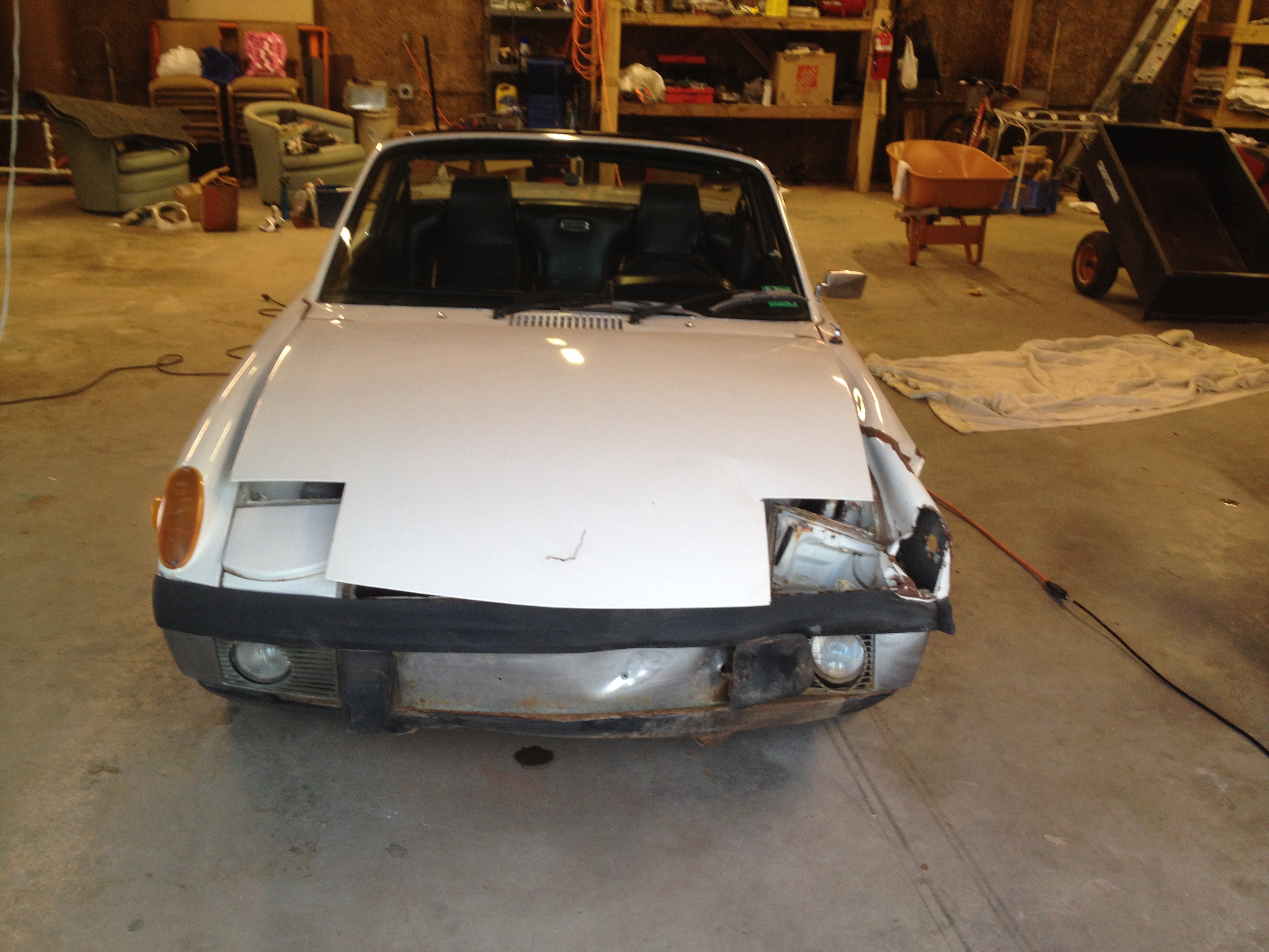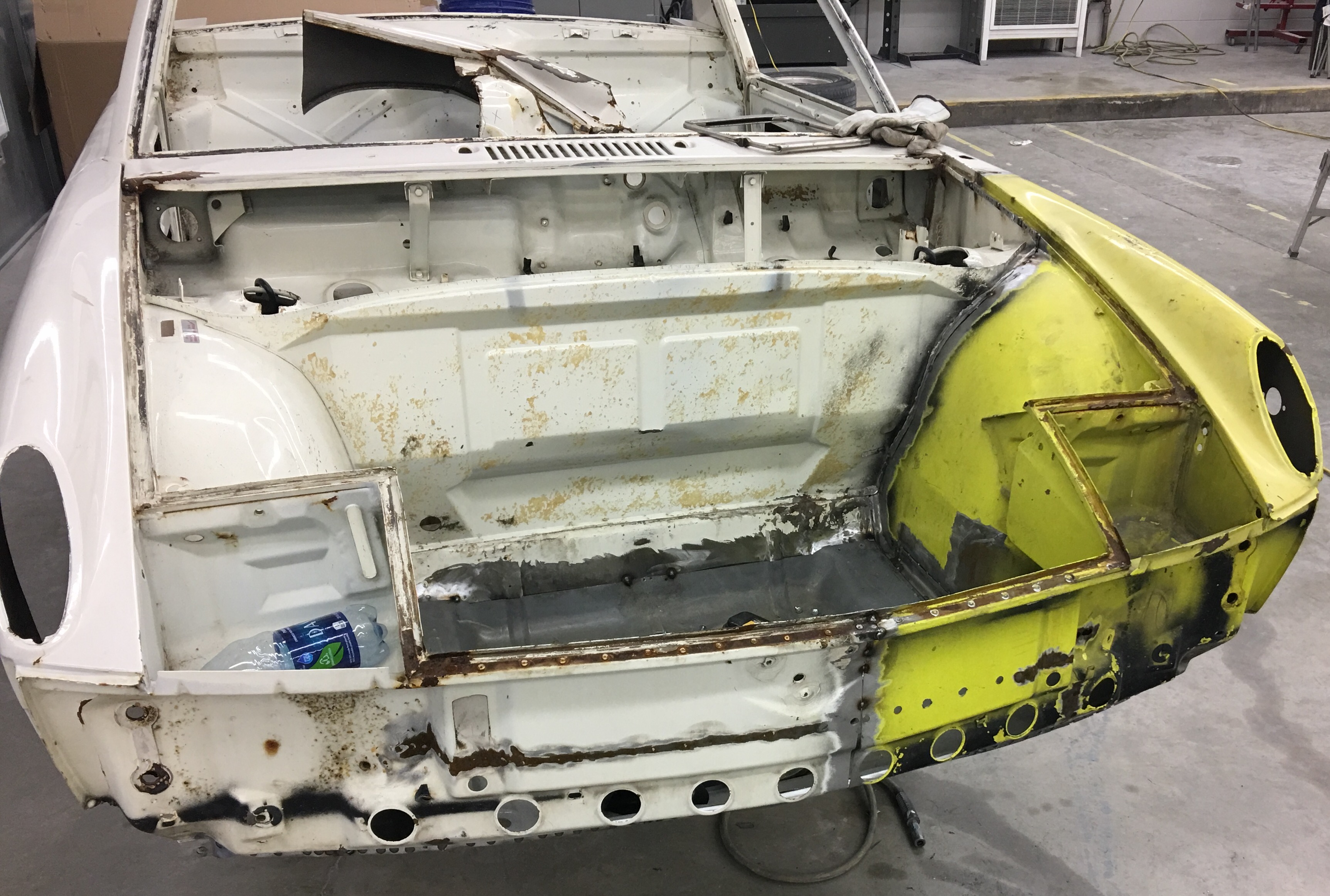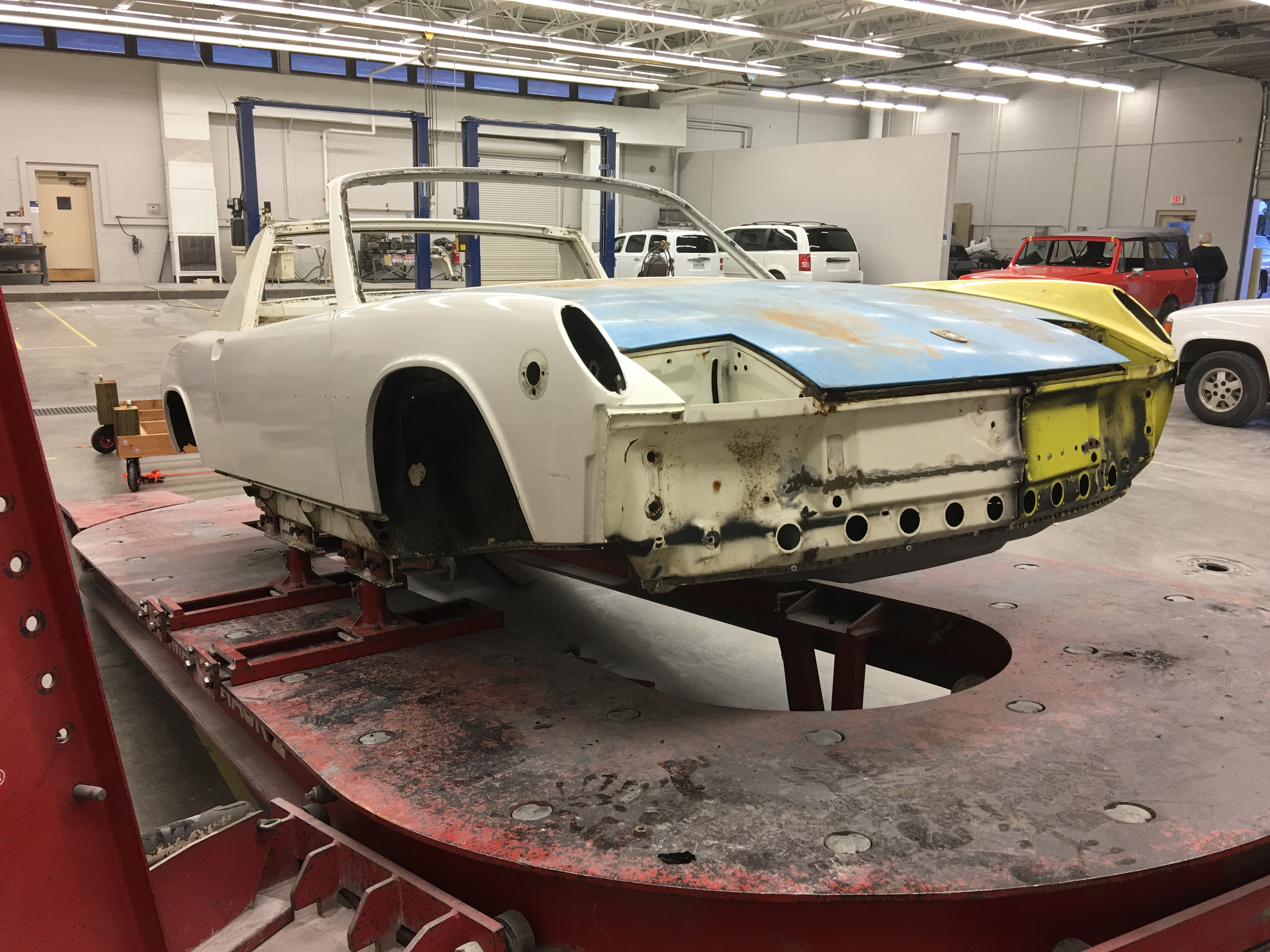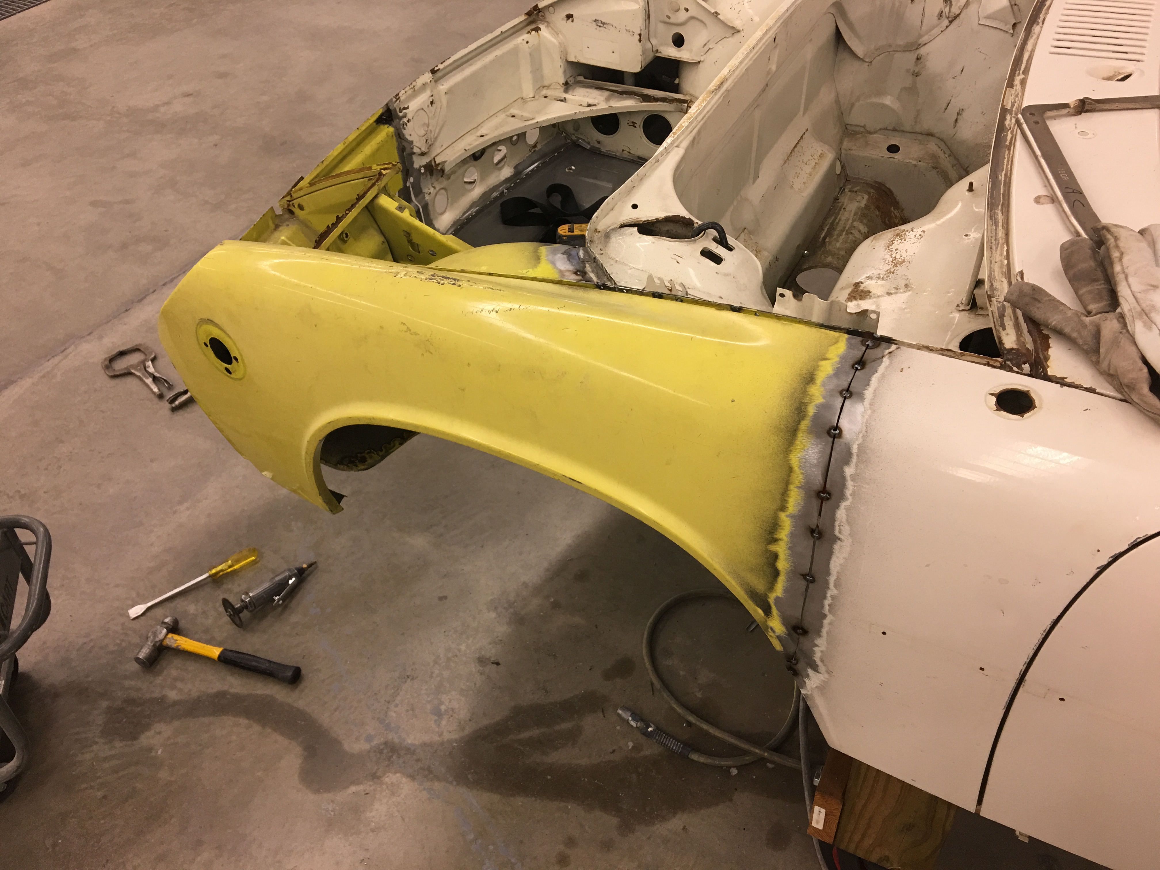 So three years after buying the car, two and a half years after Mark shipped me the front clip from California, two years after ordering the new trunk floor from Restoration Design, and multiple interruptions later, the 914 is technically one single piece of metal again: