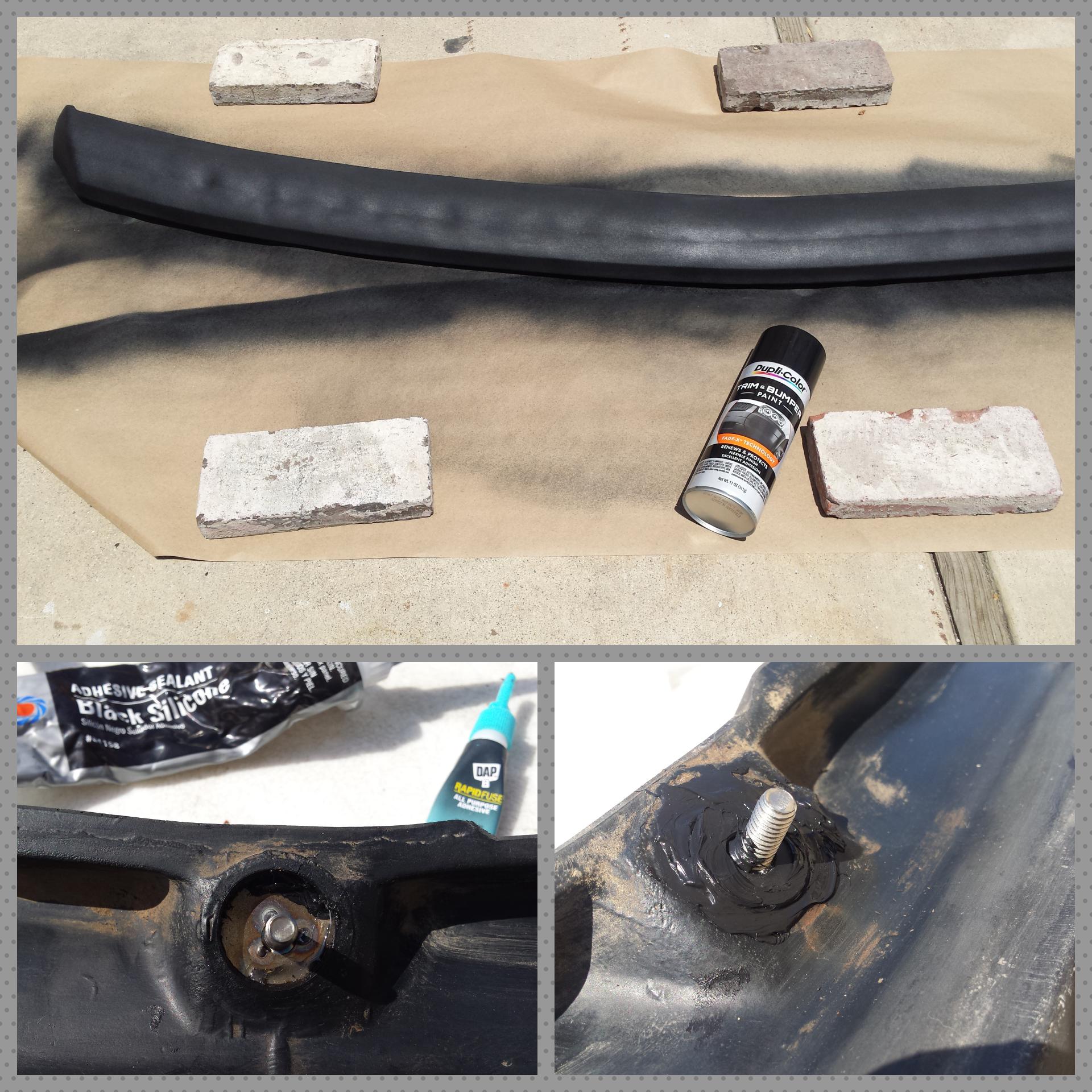 My front bumper top was in pretty bad shape so I decided to spruce it up. 3 of the 5 bolts were rusted out so I hit up the hardware store and Pep Boys and picked up some stainless fender washers and M6x1.00 machine screws and tac welded them together. Cleaned out as much loose rust in the holes of the rubber top and filled it with Dap rapidfuse glue and permatex black silicone before installing the new bolts. Sealed them up with more silicone flush with the openings.
