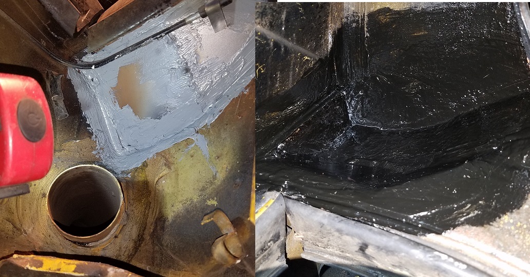 Finished installing the fuel pump harness into the fuel tank cavity. Thru the firewall with a solid grommet with a slit in it to allow the harness to go thru. Then I installed the fuel pump. Seam sealed the hell hole with brush on seam sealer. Then coated it with the first application of Eastwood HD Anti Rust. |