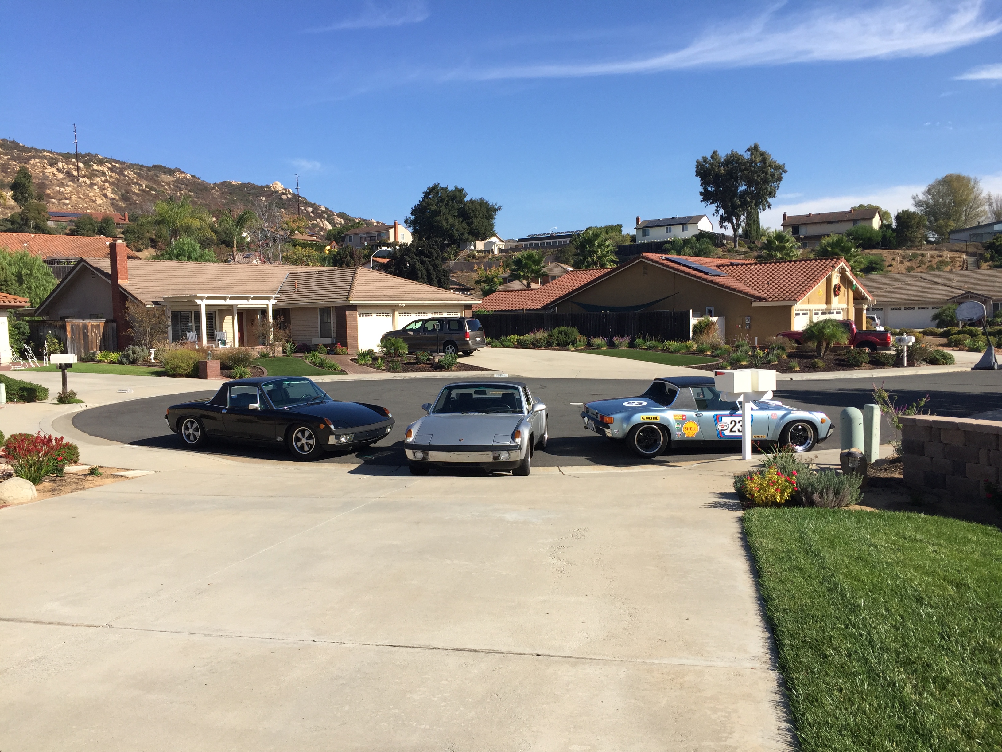 We met this morning and drove down to the Porsche swap in Escondido. The swap was a bit of a dud, but any excuse to go exercise the car. Autos International had an open house too, so we did get a brief tour of their facility and I was able to discuss my interior needs with Augustin. As we drove up to the event, Coondog was driving in from the other direction driving his new 3.0 conversion just back from PMS. Great build. Sounds glorious!! We also met up with Jim - Lucky9146, and he invited us down to his house to see his ongoing build. Wow!! He's hiding some great cars!! He is a very talented man indeed. Cars parked in the driveway to give him some 914 inspiration..... Participated in the above mentioned Porsche dud swap meet to help fund my addiction, but the best part of the day was hanging out with these guys! Not often one sees three 914's out in front of their house, at least for me! And,it was inspiring to see actual running driving 914's. It's coming! (IMG:style_emoticons/default/white914.jpg) |