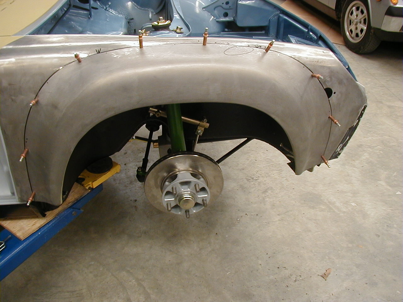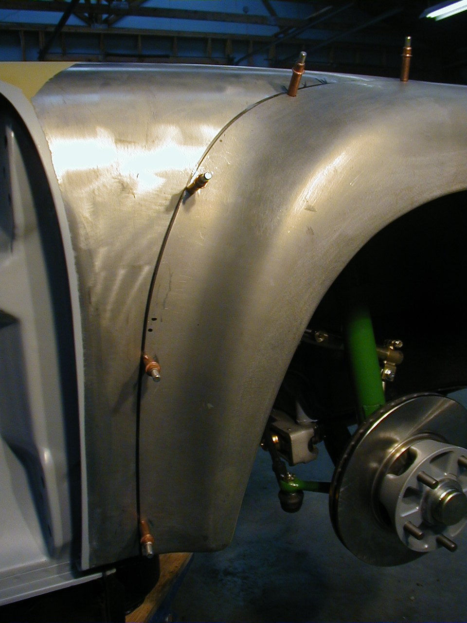The pics are great. For some reason I thought the flares were welded "on" the fender skin not butt welded. Do you dress the tack welds on the underside or leave them as is? Do you prime and paint the underside only or do you add undercoating? So you do end up welding the entire seam but it is done by spot tacks and you move around the flare to keep the heat down. Is the copper spoon something that can be purchased at welding shops? Thanks