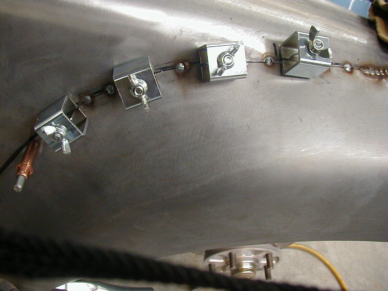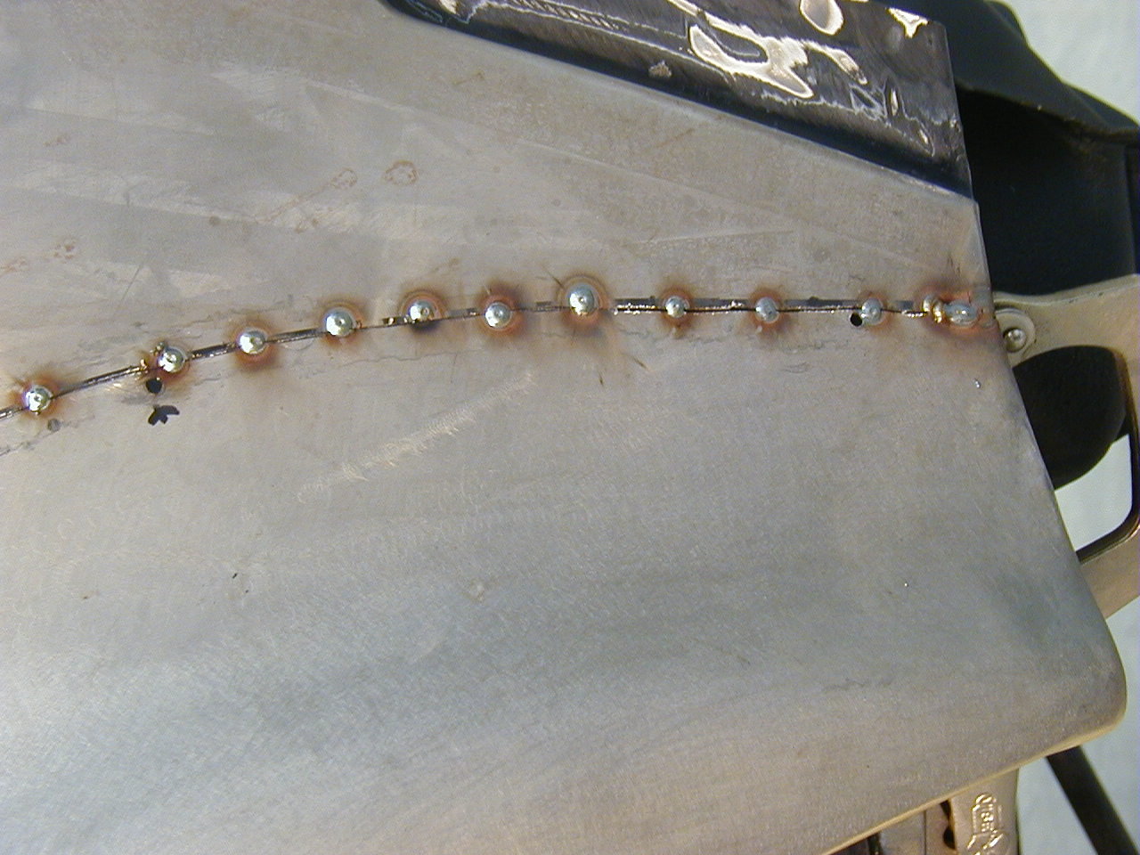 Here's what it looks like after it's cut and tacked all the way around. The small tack beads are as large as I weld. I just make small beads all the way around, using a copper spoon on the back of the weld seam to defer heat and keep from blowing through.