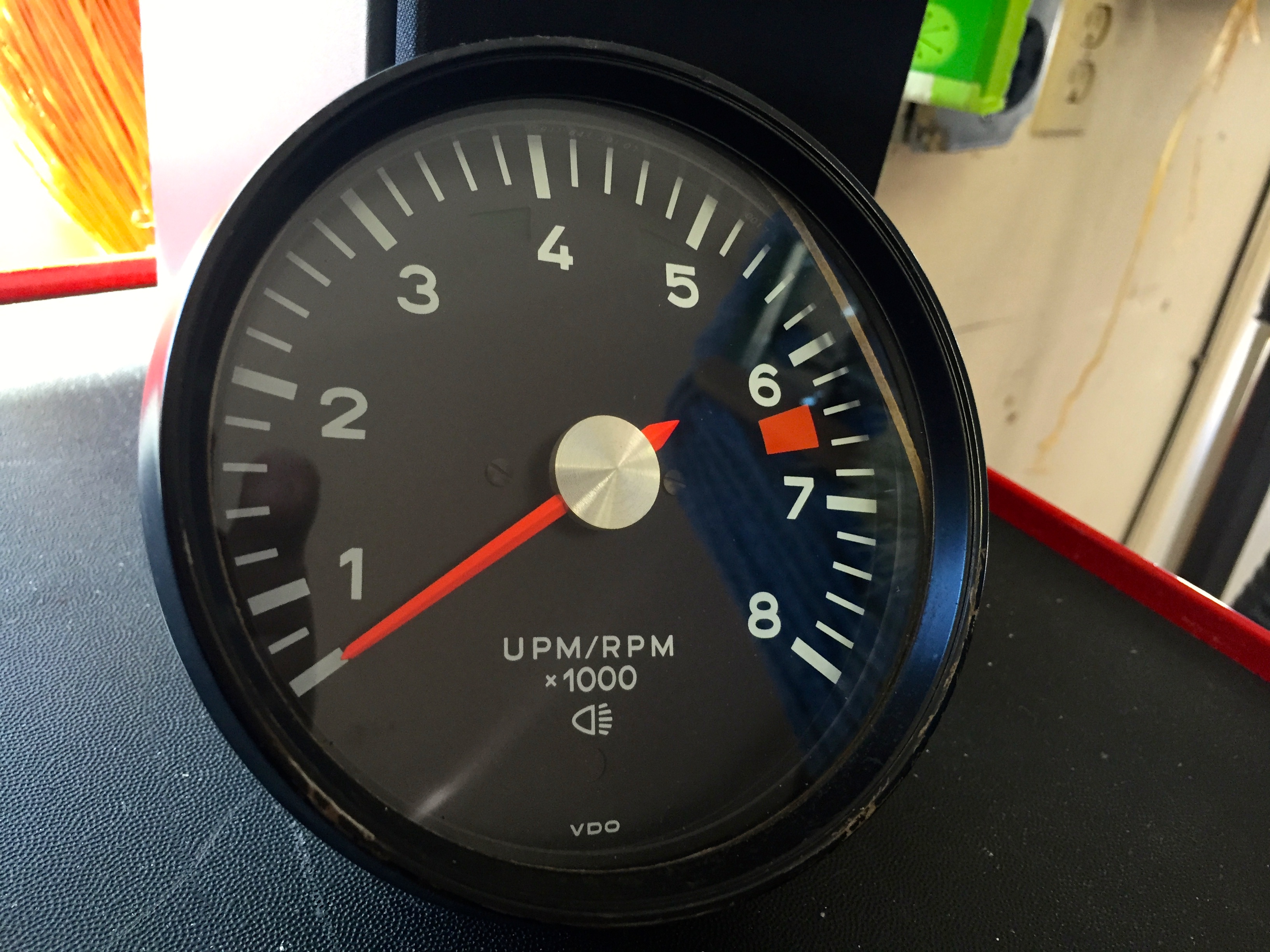 The tachometer is a different story. It will be restored and converted to work with the 3.2 Motronic motor going in the car. I am also considering having an oil pressure gauge installed into the tachometer, similar to the turbo gauges on the 930's. I figured that was the most obvious place to put this critical gauge. I am curious what other people think about that though. So please let me know your thoughts. Now the last gauge is going to convert to a triple gauge. I am thinking oil temp, cylinder head temp and possibly amps. I want that gauge to retain a fairly stock look with the typical 914-6 warning lights and symbols in it. The fuel gauge is going to move down to the storage compartment right below the dash bottom with possibly another gauge next to it. I really do not want to add a clock but can't really think of another gauge for that position. I would like to have two gauges in the storage box for balance. Please feel free to add your thoughts. Of course we will be keeping the silver dot feature of these gauges. Here is my stock tachometer: |