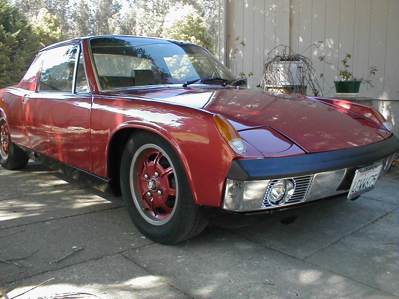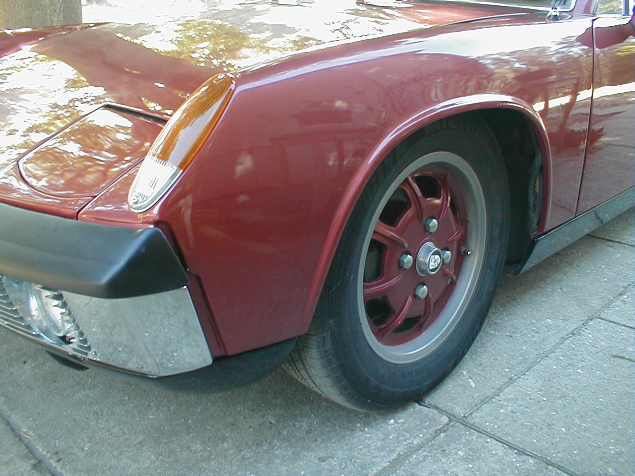 I found a very nice newly rechromed front bumper, and bought a 914rubber bumper top. I had them take care of the driver's side paint adhesion problem while they were there. I can't afford to do the surface rust, unfortunately. Steve said the battery died, so he got a cheap replacement, and the front tires look like there was an alignment issue, so I'll most likely get a new battery and replace all the tires, and get an alignment. |