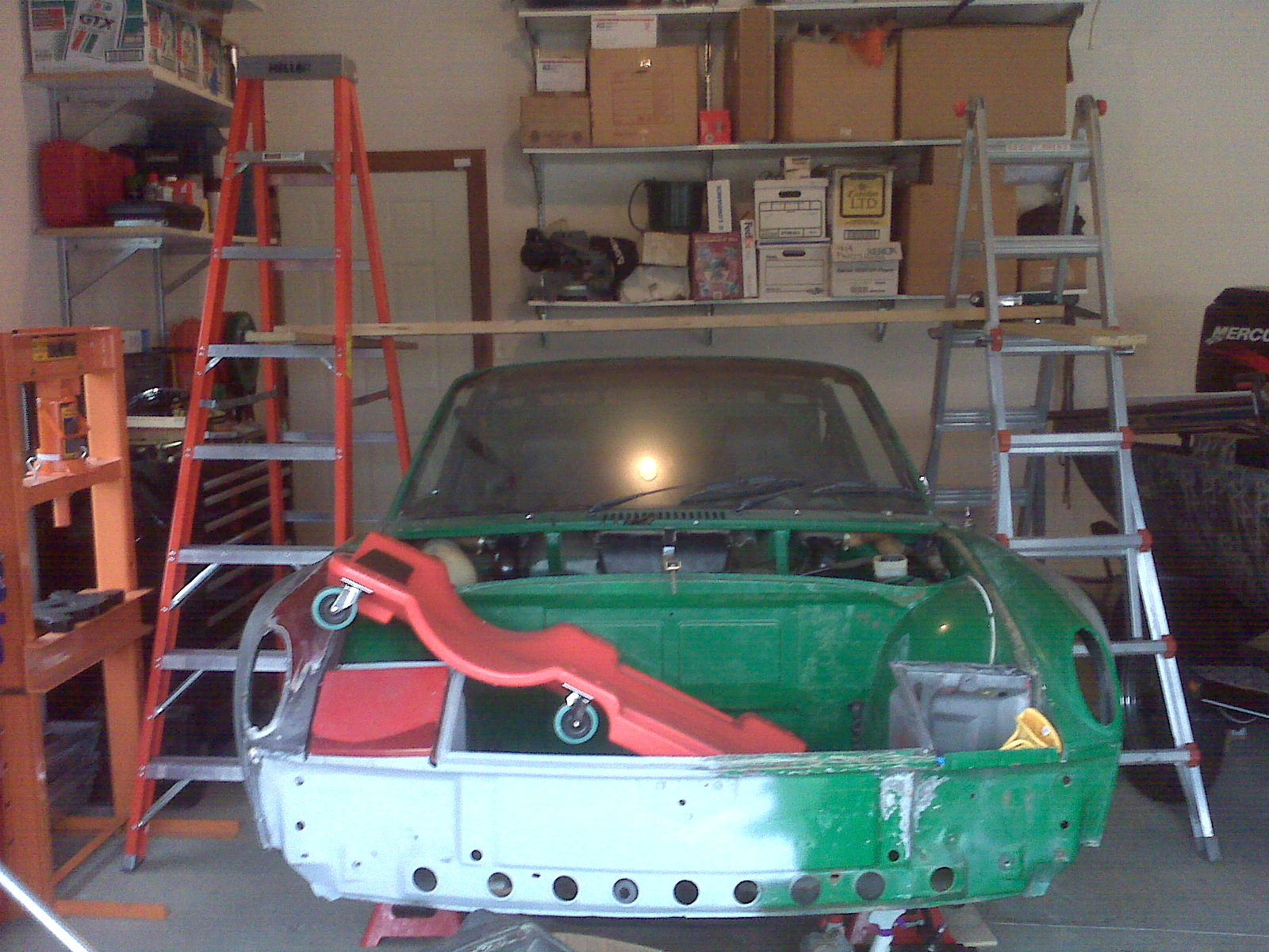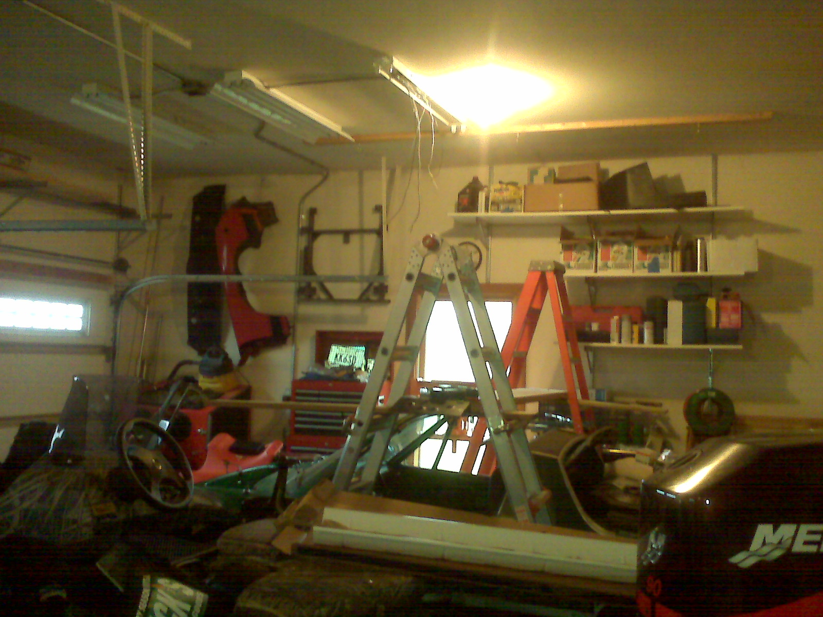 The Slacker thread hit home for me. I haven't done much if anything on my car this year. One of the big reasons was that my garage had lousy lighting. I could work on it in the daytime with the door open but I rarely have time during the day with work and the kids sports. At night, forget about it. One 70 watt bult just doesn't cut it. I decided to finally install some lights. One huge problem was that my 914 was on jackstands. How the heck was I going to get above it. I finally found good use for those tractor mower ramps.
