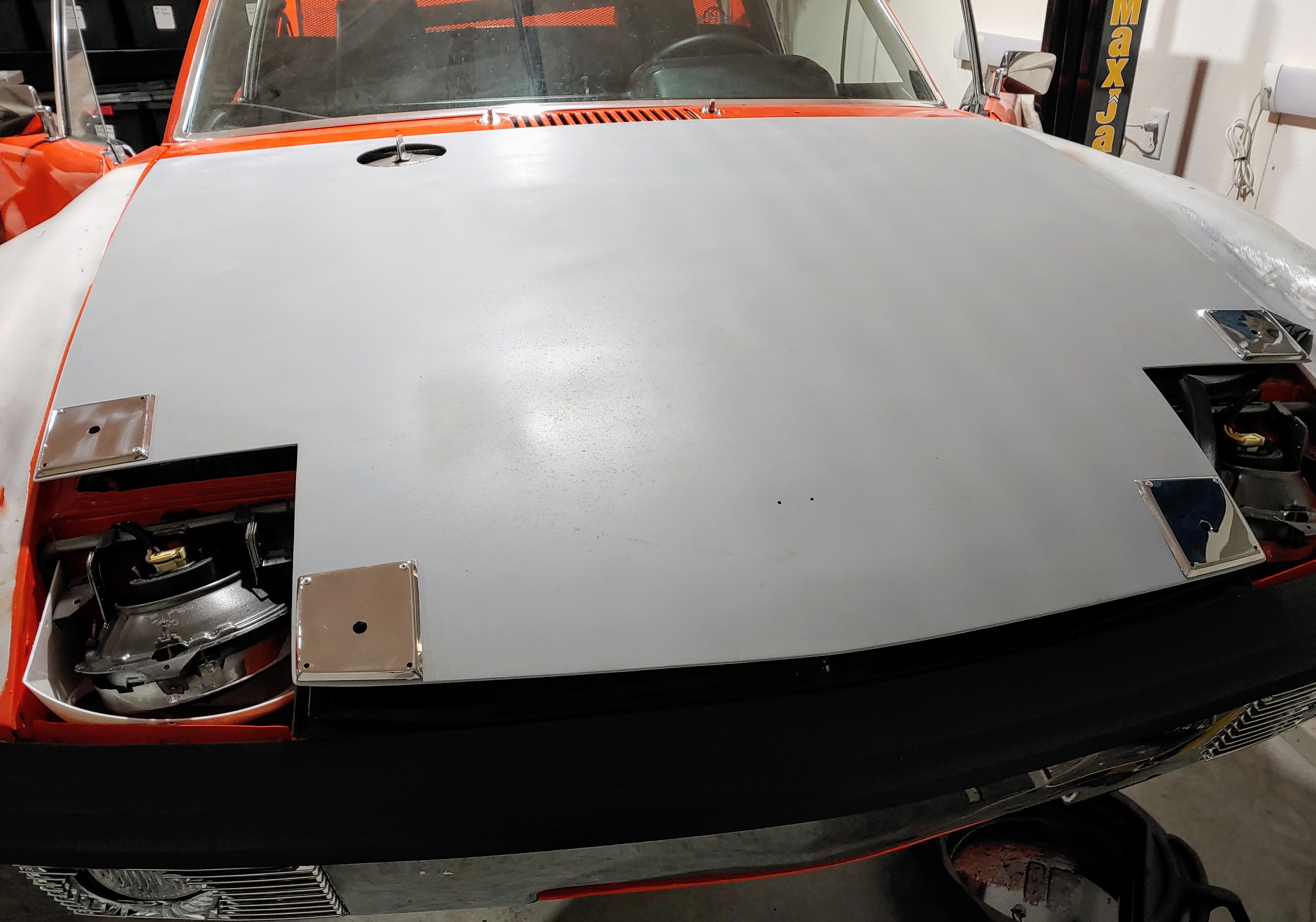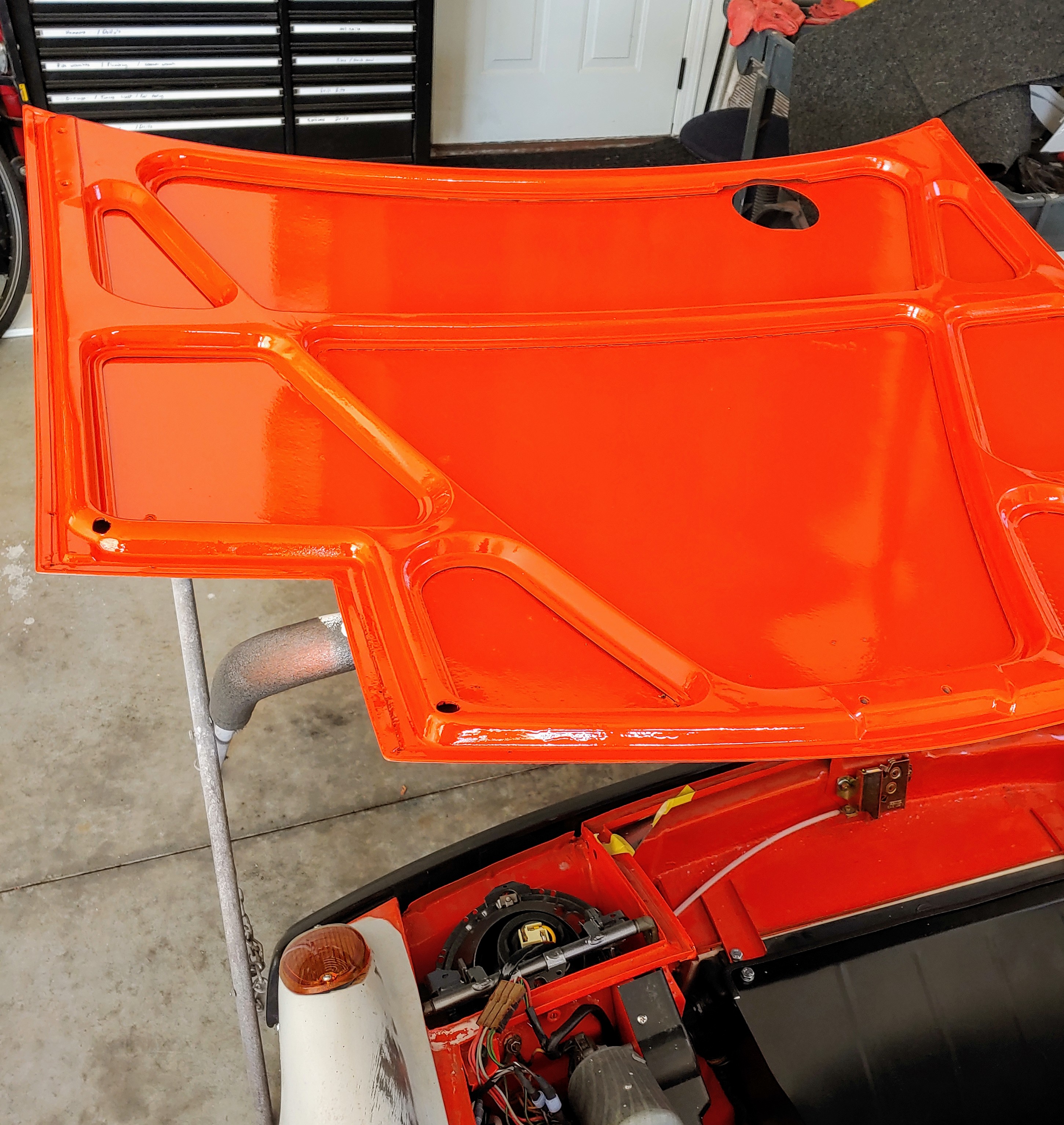 Spent an hour this morning and sprayed the underside of the hood and the headlight covers.. Those will need a wetsand and buff but turned out flat for a garage. Also took it for spin around the neighborhood in 1st and Second gear. When I got back I decided I just had to get a 123 ignition for it. Just can't stand the idea of points and messing with timing old school way. I will have a brand new restored 2.4-2.7 distributor for sale shortly.