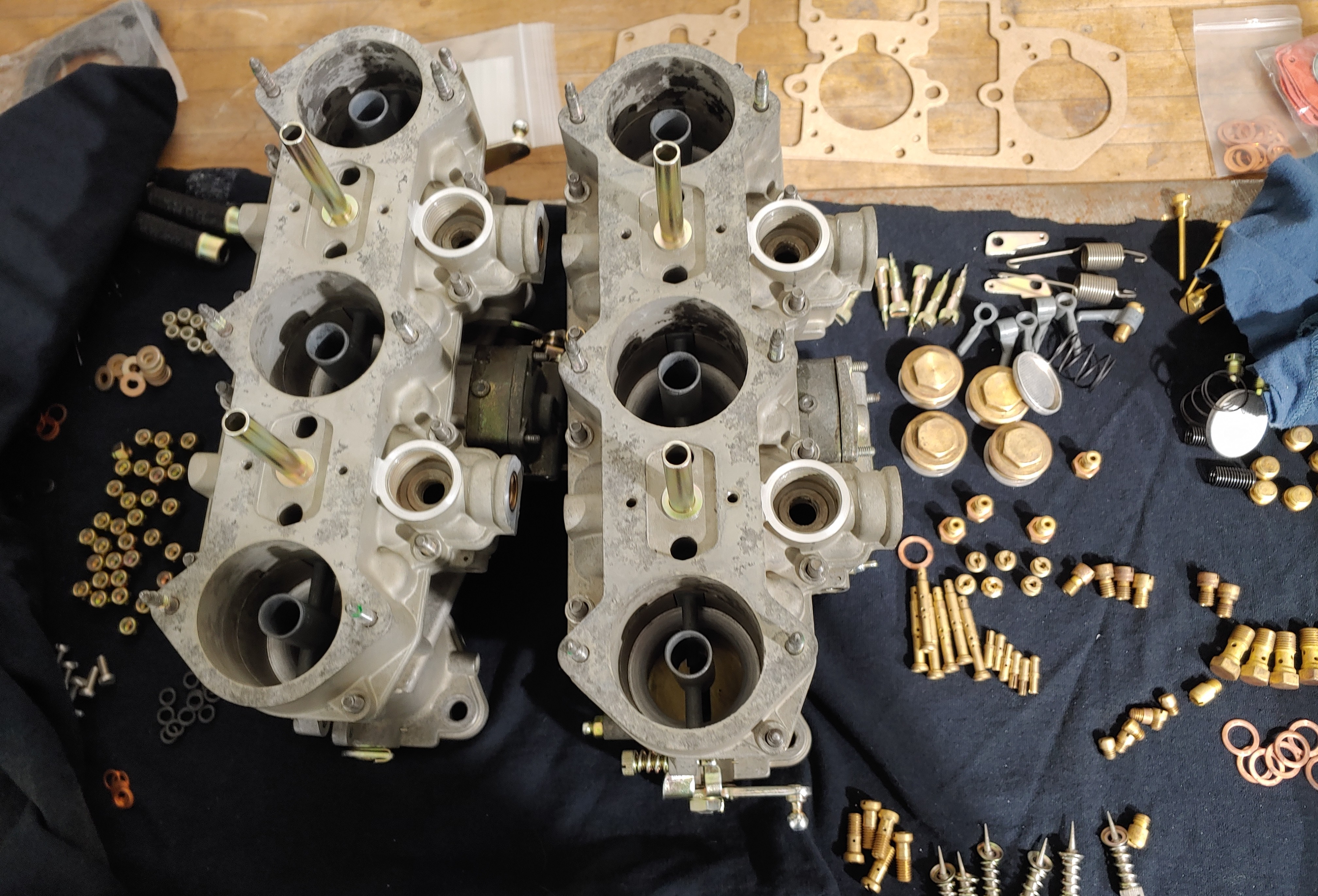 I had the top side sprayed at a friends shop so I didn't have to make a mess in the attached garage.. All thats left is the front fenders and I will finish the body work this winter and spray in spring. Carbs just got back from performance oriented as I needed the carb bushings done and an IDA conversion.. |