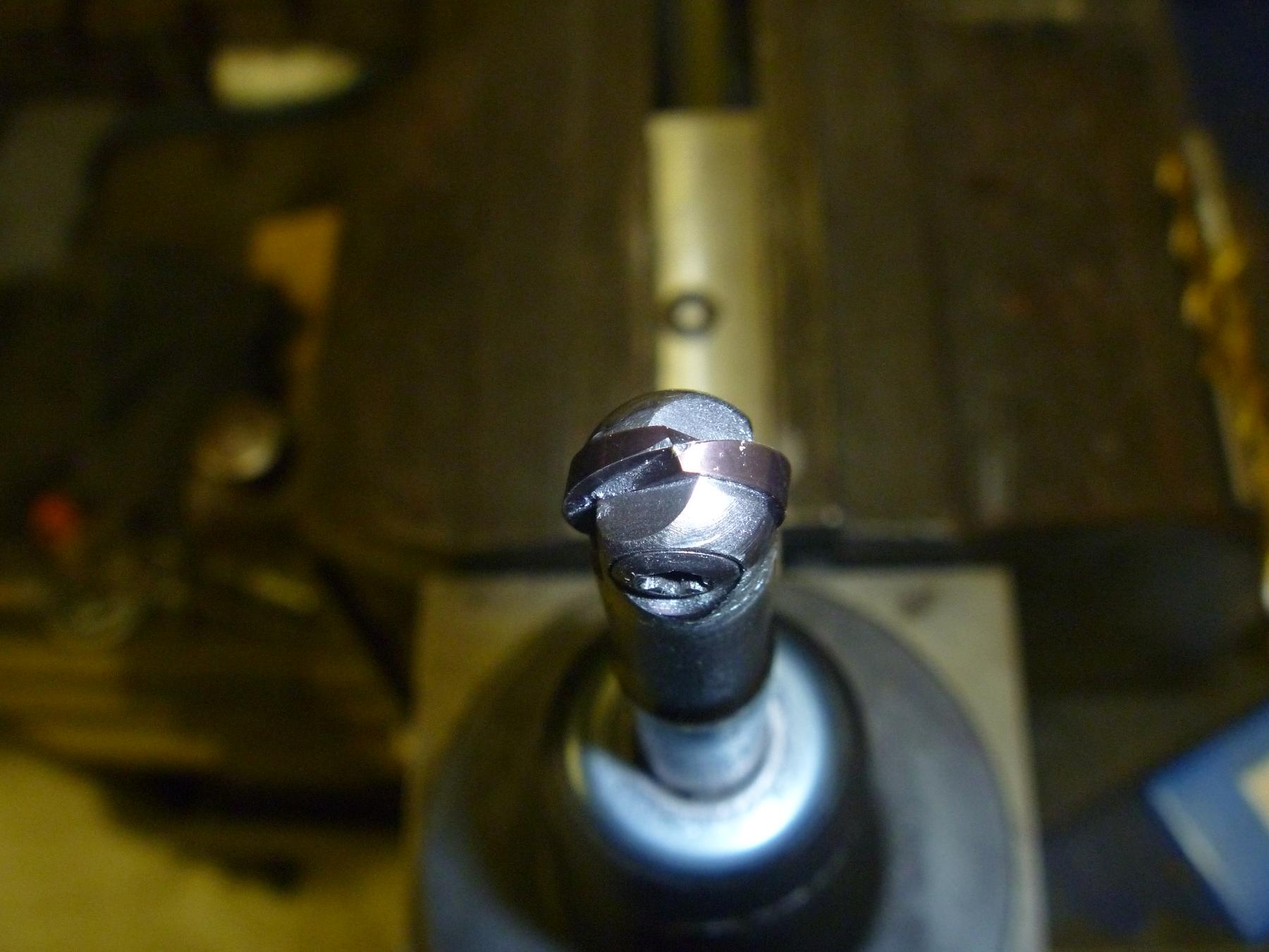 You can see where I changed the carbide insert for the cutter. I changed it about every 12 hours and used 12 inserts. Obviously some of the inserts were used longer than that, but 12 hours is what I found was a good time to make a change. The longer I leave one in, the more polishing I need to do to blend all the surfaces. The outer edge was done with a larger 1.25" ballnose cutter and had a larger stepover too, so that is why it looks rougher and less shiny. You can see here how the insert wears. |