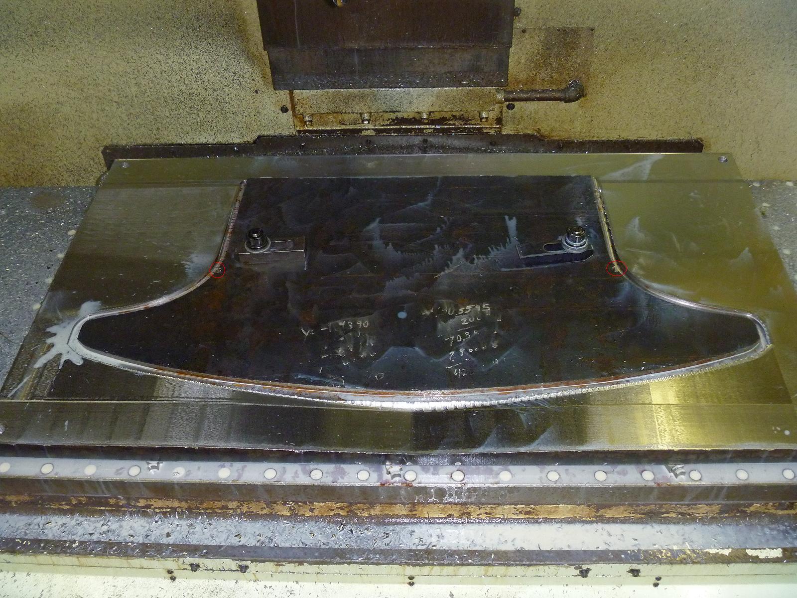 I am machining the drawpad as I type this. It is running the finishing pass, and then I have to cut out the slug in the center. The reason I did things in this order, is so I can clamp the piece to the table. I have two dowels holding the piece from twisting and then two clamps in the center. After the machining is done on the outside, I will put clamps on the exterior and cut out the slug in the middle. I circled the dowel positions in red |