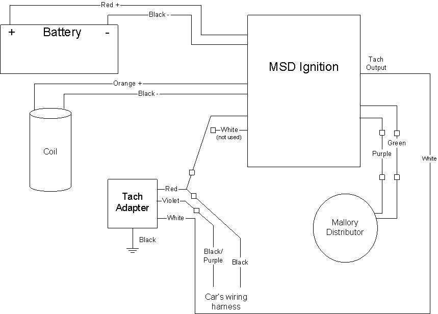 First, the MSD tach adapter has to be an 8920. (Can someone (DD) please contact PP and have them change their MSD ignition tech article? Anyway here's the wiring: 1. Red and Black wires from the 'front side' of the MSD box to the battery. Red to + (positive), Black to - (negative). 2. Orange and Black wires from the 'front side' of the MSD box to the coil. Orange to + (positive), Black to - (negative). 3. Violet and Green wires from the 'back side' of the MSD box to the adapter then to the Mallory distributor. (There's only one way the wires will connect using their supplied quick connect.) 4. Red and White wires from the 'front side' of the MSD box. The white wire is not used (please cover with electrical tape). The red wire will connect to a 'pig tail'. 5. There are 4 wires that come out of the tach adapter. Red to 'pig tail'. White to the tach output on the 'back side' of the MSD box. Violet to the purple/black wire (from the car's wiring harness) that used to be connected to the negative (-) side of the coil, originally. Black to ground. 6. Finally, the black wire (from the car's wiring harness) that used to connect to the positive (+) side of the coil originally, connected to the 'pig tail'. Once everything was wired correctly, the car started and ran great. Also the tach worked.... (IMG:style_emoticons/default/biggrin.gif) BTW, my car is a '74 2.0l. The tach is the silver dot, with the (2) turn indicators. Before purchasing the tach adapter, I would recommend wiring the purple/black to the tach output on the MSD box first. If the tach doesn't work, then purchase the 8920 tach adapter. I purchased the tach adapter locally for $50. I hope that this will help others that have tried to use the original tach. There have been several members that have recommended either purchasing a new tach or sending the tach out to 'convert' it. Here's a shot of everything hooked up.... I'll post a wiring diagram tomorrow... -- Rob ![]() |
