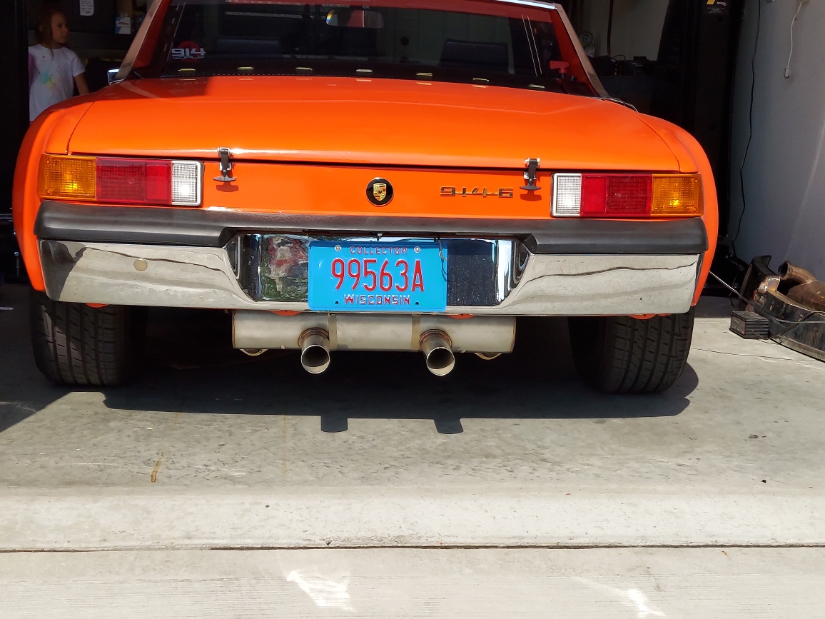 Stainless steel 914-6 muffler. 2 in, 2 out sport muffler. Not quiet but not too LOUD. You can hear the engine with this one but it’s a six so that’s a good thing. This muffler is lightly used by the builder for some test miles. It still looks good and works perfectly but is starting to show the normal bronzing from heating up stainless.