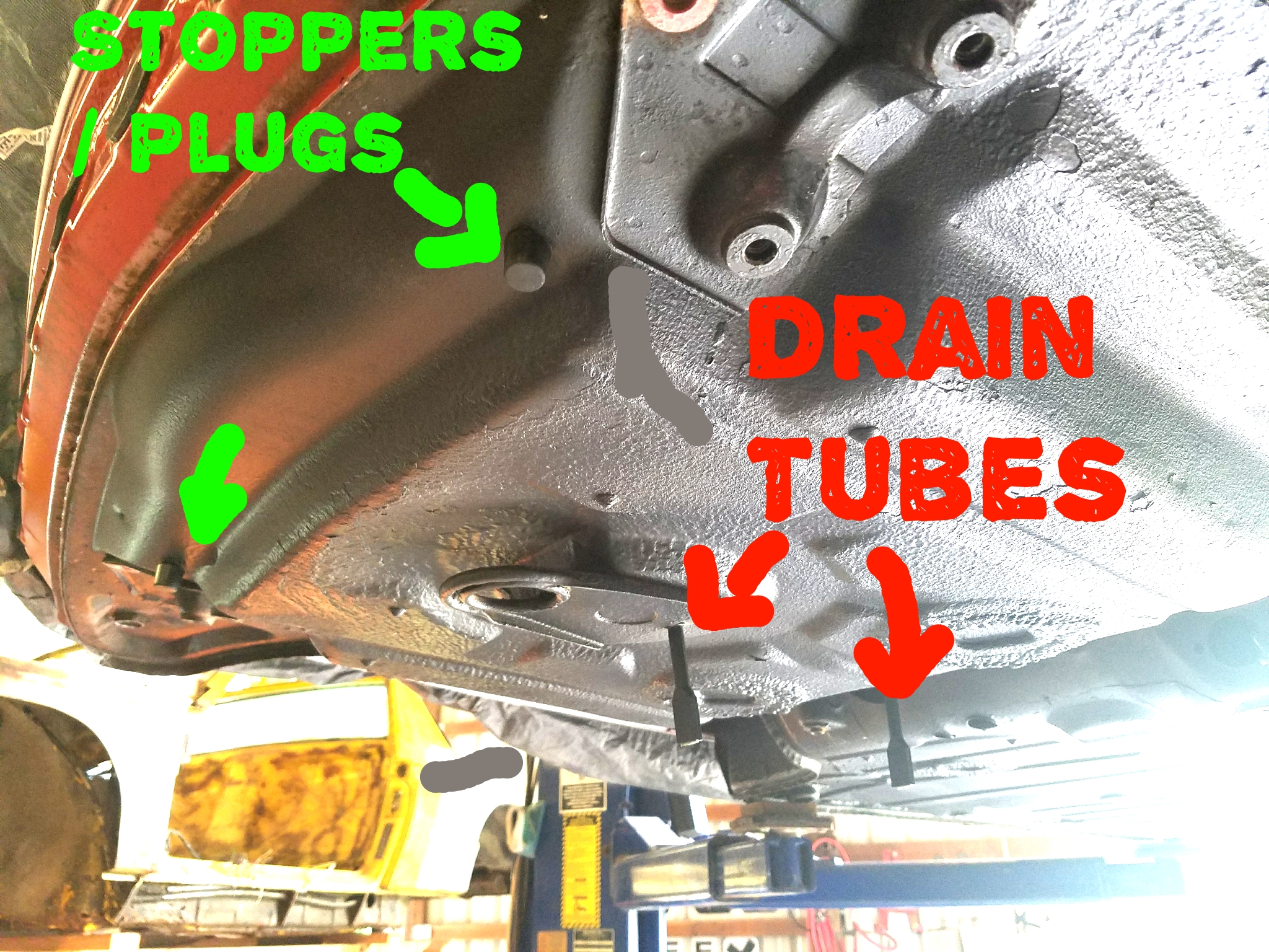 Great pics! I'm missing one of the stoppers and both tubes. The little plugs that you have in your frunk (4 of them between the stoppers and tubes) look to be what should be in the passenger floor as well. Stoppers would certainly do the trick if the holes are the same size. These? That's one we don't make yet but seem pretty important for keeping your trunk dry. (And possibly to plug previous owners "fix") Attached thumbnail(s) |
