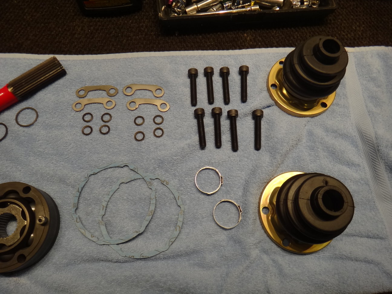 Nice time for some inside projects? What's a person to do? Could make miniature snowmen with the wifey? Or.... Finally get around to putting this mess of parts together! Doing the PMB classic high hp axle build up. Purchased the Sway-A-Way axles, located a good set of 2nd hand 911 axles, got everything cleaned up & replated, purchased the necessary new items and I was ready. New CV boots and gaskets off Ebay. Belmetric sent me the Oetiker ear clamps (74mm and 35mm), M10 zinc plated Schnorr washers, and the Grade 12.9 M10x50 CV bolts. |
