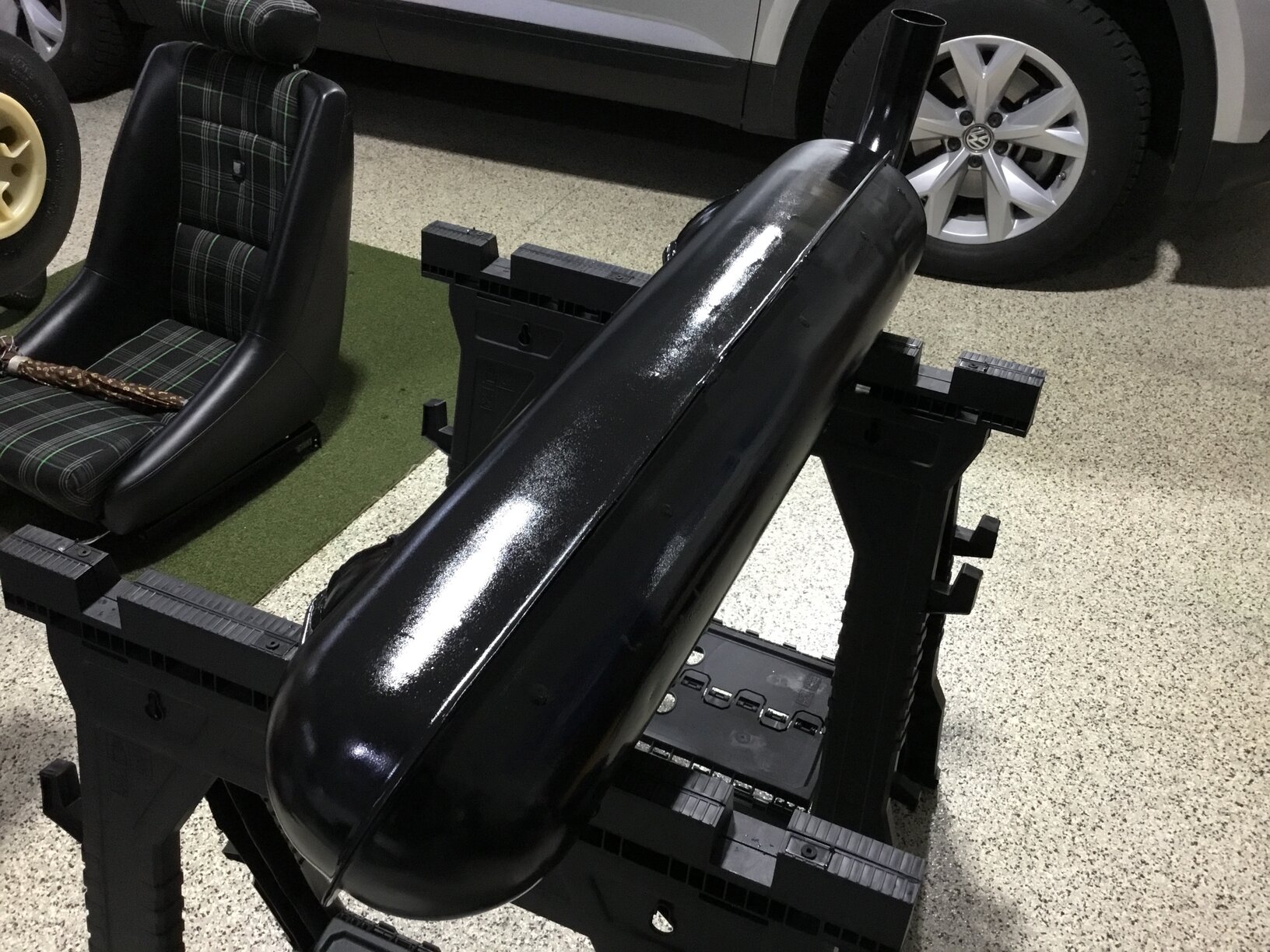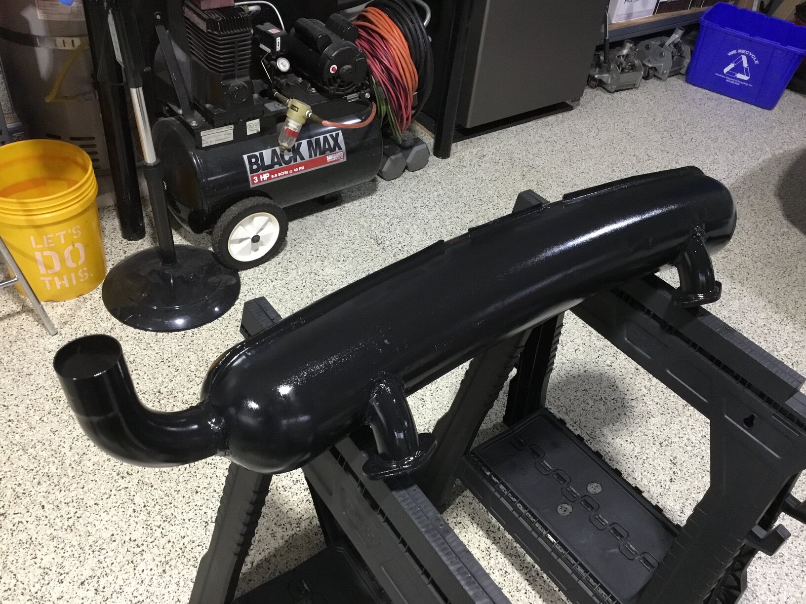 When I had the engine built, Rothsport dyno'd the engine with the sport exhaust along with a stock Leistritz single outlet muffler. The sport exhaust made a bit more power on the top end....but not all that much. I wanted to go with the Leistritz but the outlet had never been fit and welded to pass under the rear valance on my car. Luckily we have a great muffler shop in Boring where I live that has a very talented fabricator/welder. I spent a couple of hours with him a week ago and fit a new tip to the Leistritz. His welding was killer good and the new outlet install looked factory. I had previously had the Leistritz ceramic coated, so I needed to address the new semi stainless tip. The ceramic coater is quite expensive, but I found something online that looked like it could work. So I purchased a can of this stuff from Eastwood. It's 2K product, so you mix the 2 sections of the can (one that includes the catalyzer) and you're good to go. Once mixed, this product lasts about 48 hrs which is an eternity compared to other 2K spray products I've used. End result looked great....don't go by my crummy pics. Also installed the nice factory chrome tip that goes on these mufflers. Pics on the car in the morning and I'll share a video so you can hear it. Sounds a million times better than the sport muffler. Very much early 911-ish. Liking it. |