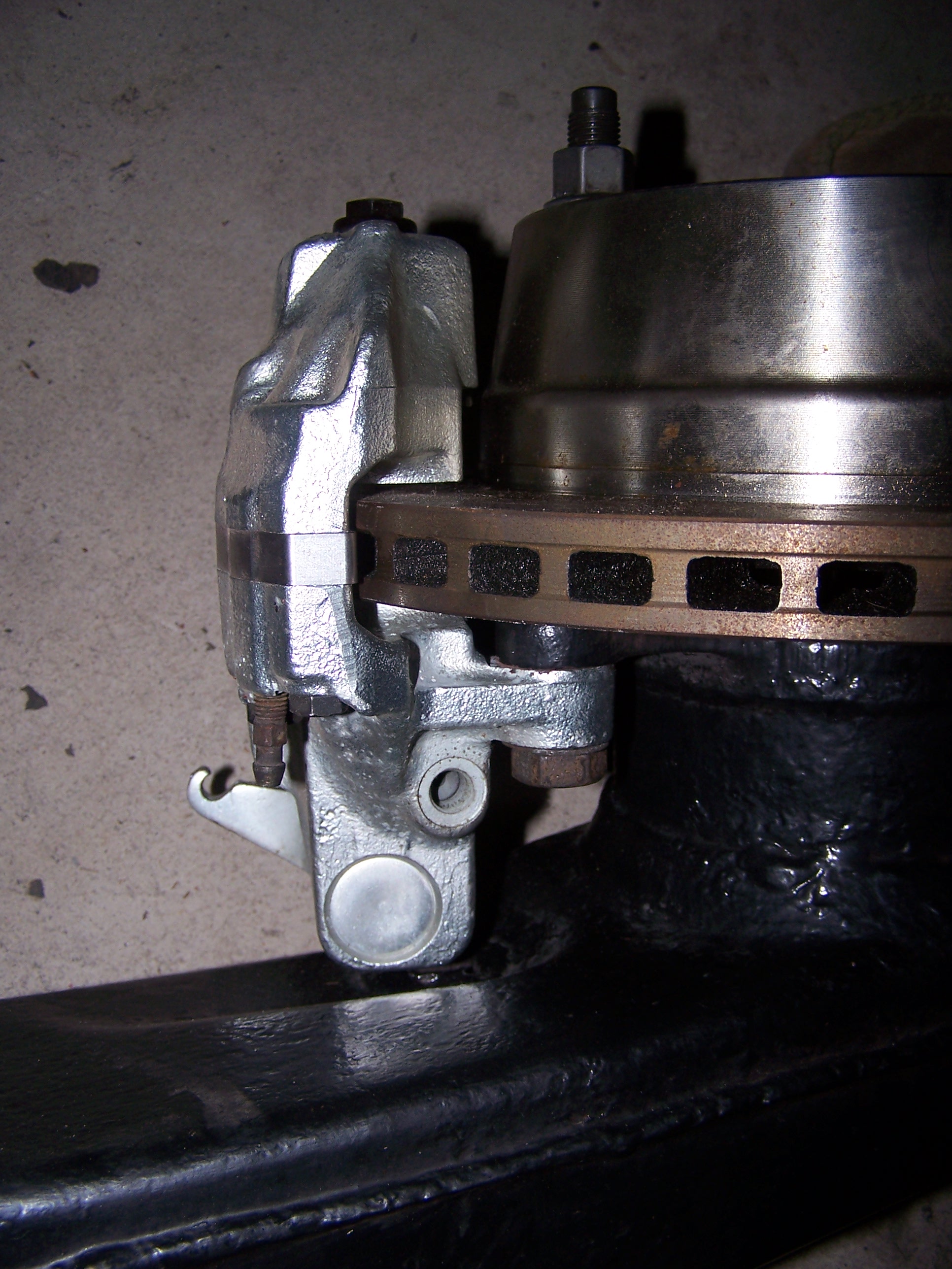 The rear will have vented rotors. I have some questions about doing this part of the conversion. Two questions: 1) Will I need longer studs in the rear? Before adding the spacer, a lug would catch with 11 rotations on a stud. After adding the spacer, a lug catches with only 8 rotations. 2) When I add the spacer, the rotor is no longer centered perfectly on the hub. How do I center the rotor on the hub? 911 Hub Hub with spacer Hub with spacer and rotor. 911 rotor has been cut by Eric Shea. Thanks E. ![]() With the spacer, the lug only catches with 8 revolutions, down from 11 in its stock state. Is this enough or do I need longer studs? ![]() With the spacer, the rotor lip that centers it on the hub now misses the hub because of the spacer. How do I center the rotor now? Do I use just the 2 little hold-on screws to center? ![]() One of the calipers that will be used. ![]() |