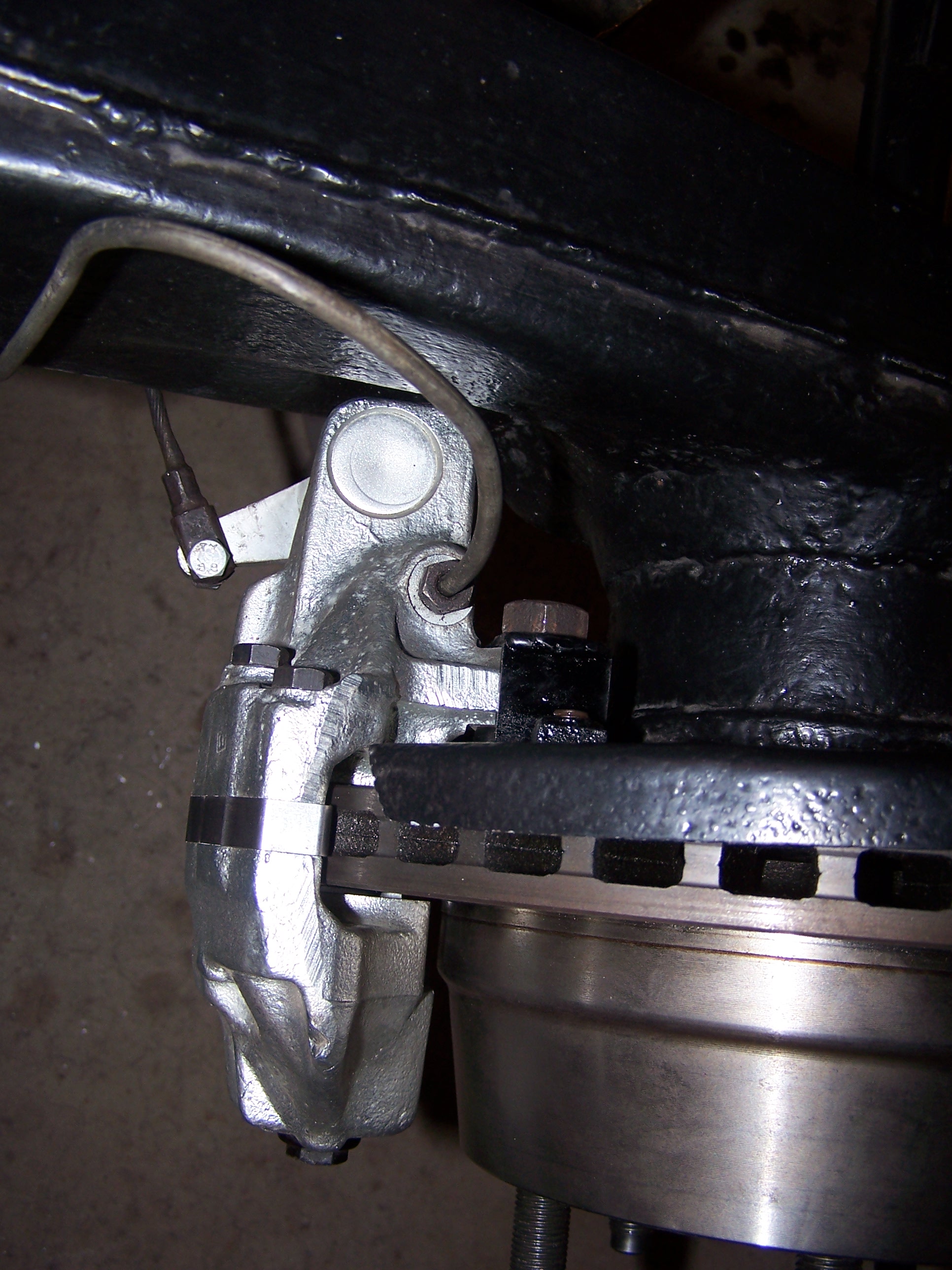 I just did this, they should pull out after you unhook the cables inside behind the driver's seat. my problem was that they were rusted to the caliper solid! I had to cut the cable etc. I have not yet gotten to the point of setting the venting and bleeding them, i'm doing the front now first, and new master cylinder. good luck! Jim, In your situation, wouldn't the shield mount effectively act as "one" of your washers? Jerry is using spacers under his rotor. You're going the route of under the mounting ears right? Having the shield mount as your last (or first, depending on how you look at it) spacer should keep the original geometry the same. Jerry, why did you end up grinding the caliper and not the (already modified) shield mount? Thanks ! Worked good. Had to glue the washers to the bracket in order to keep it together. Got a While Your There question; I have a pair on new E-brake cables, will the old ones pull out after unhooking the ends that terminate at the e-brake handle ? |