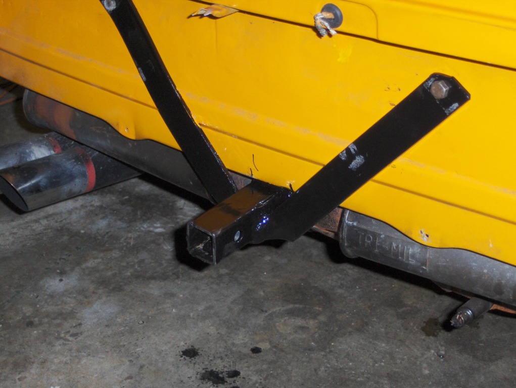 Here are some photos of my trailer hitch, along with some of my kayak carrier. My hobby is whitewater kayaking in the NC and Tn mountains. With this setup, I can enjoy the drive to the rivers as well as the time spent on the rivers. I made a 1 1/4" tubular hitch receiverfor a trailer hitch. This can hold a trailer ball, a bike rack, or the rig I show to hold up the back of the kayaks. The reciever is supported on the rear by the two bars that I bent up to hug the rear of the car, and go beneath the bumper. These are shown in the photo. The inside of the tube is welded to a 2" by 1/2" inch bar that I heated and bent to follow the underside of the trunk up to the point below the center trunk reinforcement, where I have it bolted through the trunk floor. I cut a notch in the sheet metal heat shield for the muffler to allow this bar to hug the trunk floor. This bar then easily clears a stock muffler, tranny, etc. I notched out the back valence to clear the receiver tube. For the front kayak support, I made two aluminum receiver blocks that bolt into the existing tapped holes under the roll bar. These blocks have a notch cut into them that accepts a 3/4 inch square tubular element which is held in place by a simple quick lock 1/4 inch pin. I leave the blocks on all the time. The pins are pulled to allow the crossbar to be simply removed. Works great, carrying up to two kayaks. I was curious to see if the wind from trucks, etc. would cause any problems when I was going down the road at 70 or so. But, no problems. JoeO |