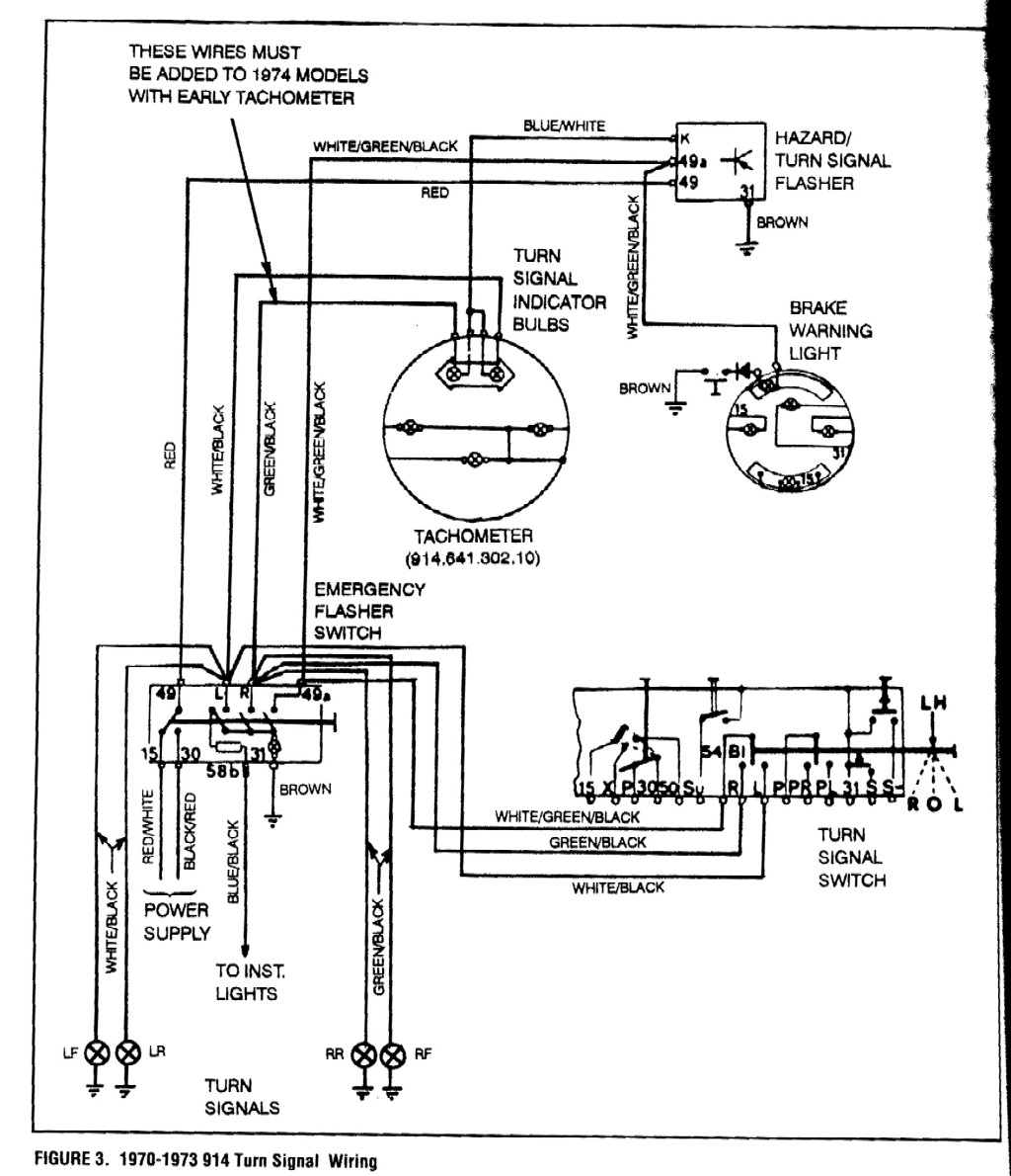 They show the additional wire required (as was installed in 1970-1973 cars) for the individual indicators to work. jk76.914 has it right. Two wires are added: green/black and white/black are added between the flasher relay and the indicator bulbs. The blue/white wire is terminated to the other side of both bulbs. BTW, did you know that PCA is giving away sets of the UpFixin der Porsche? I saw an add in last month's Panorama and got my set today in the mail. It is missing Vol 7, but otherwise it is complete and only cost me shipping. |
