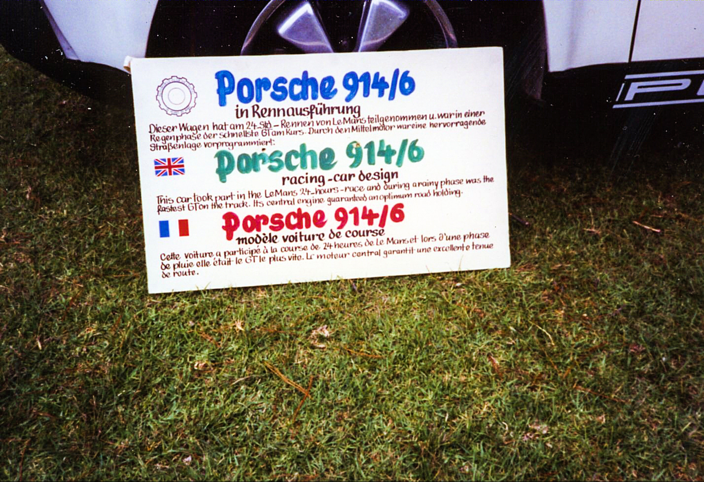 Easy enough for my graphic artist friend to repro ! The sign was with the #40 while on display in the Technik Museum Sinsheim as well. Here's a pic from the mid '90s, (taken by my friend Scott) at Pomona during a PCA tribute to Vasek Polak. My black six parked adjacent to #40...and Mike (prior owner #40) walking by the front of it. |