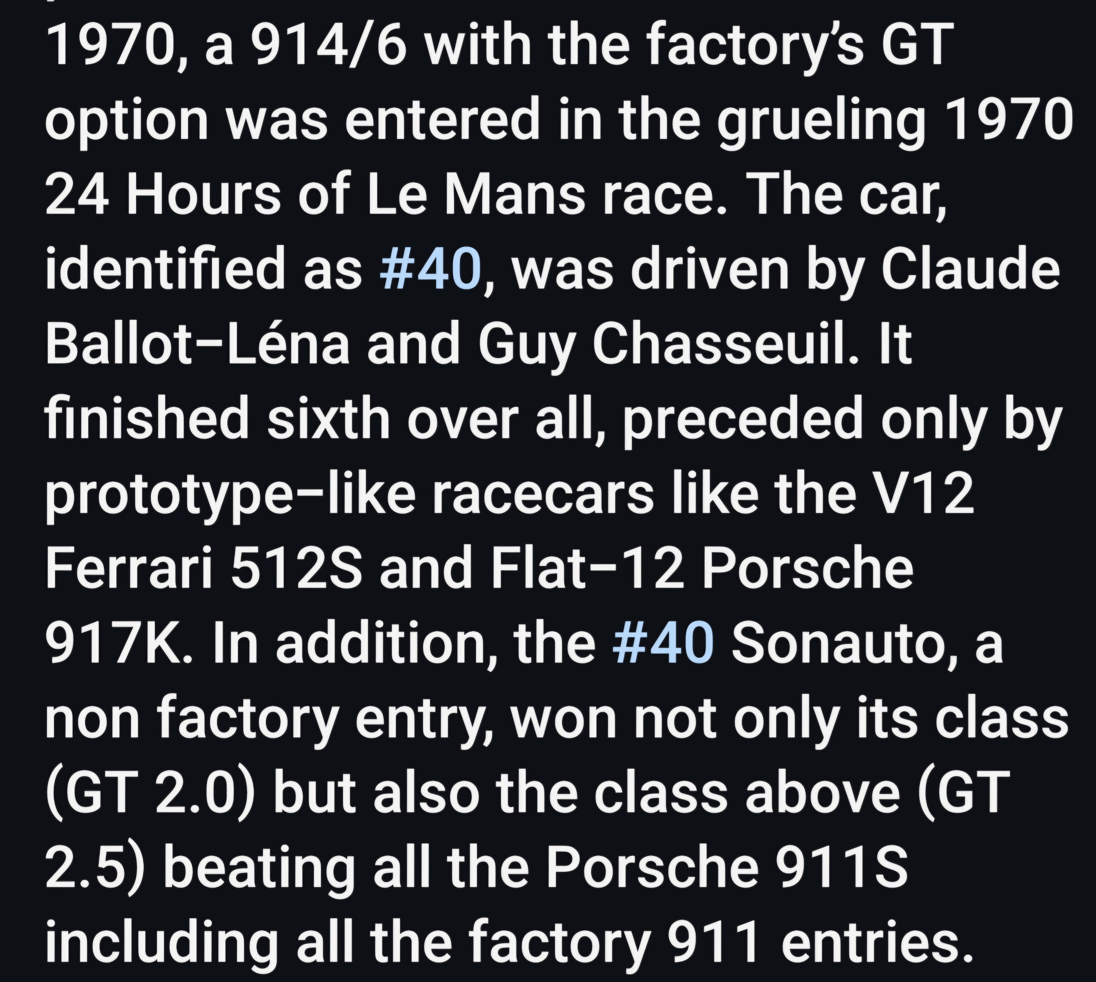 That big engine Ferrari only beat your 914-6 GT by 20 laps.
