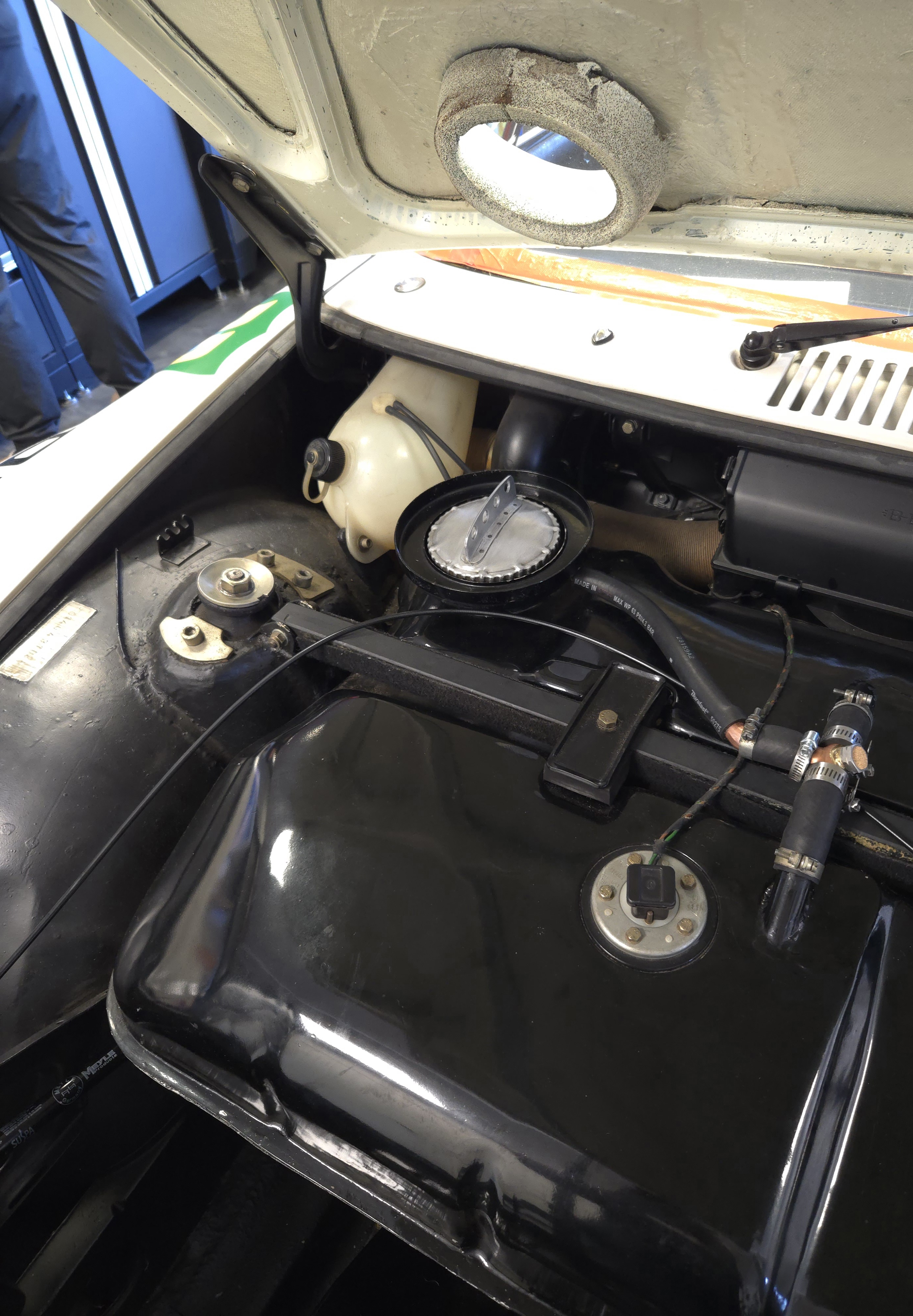 Prototype for the venting of the GT fill-cap, using a bronze-mesh style mini breather. I mounted at the highest point, and sits in the top of the tank (slosh) balance tube. I might take this another step and set up an activated charcoal canister to further capture any vented fumes. Unfortunately when we closed the deal on #40, there was nothing at the top of the 100 Liter gt tank...seller just says "Because racecar"