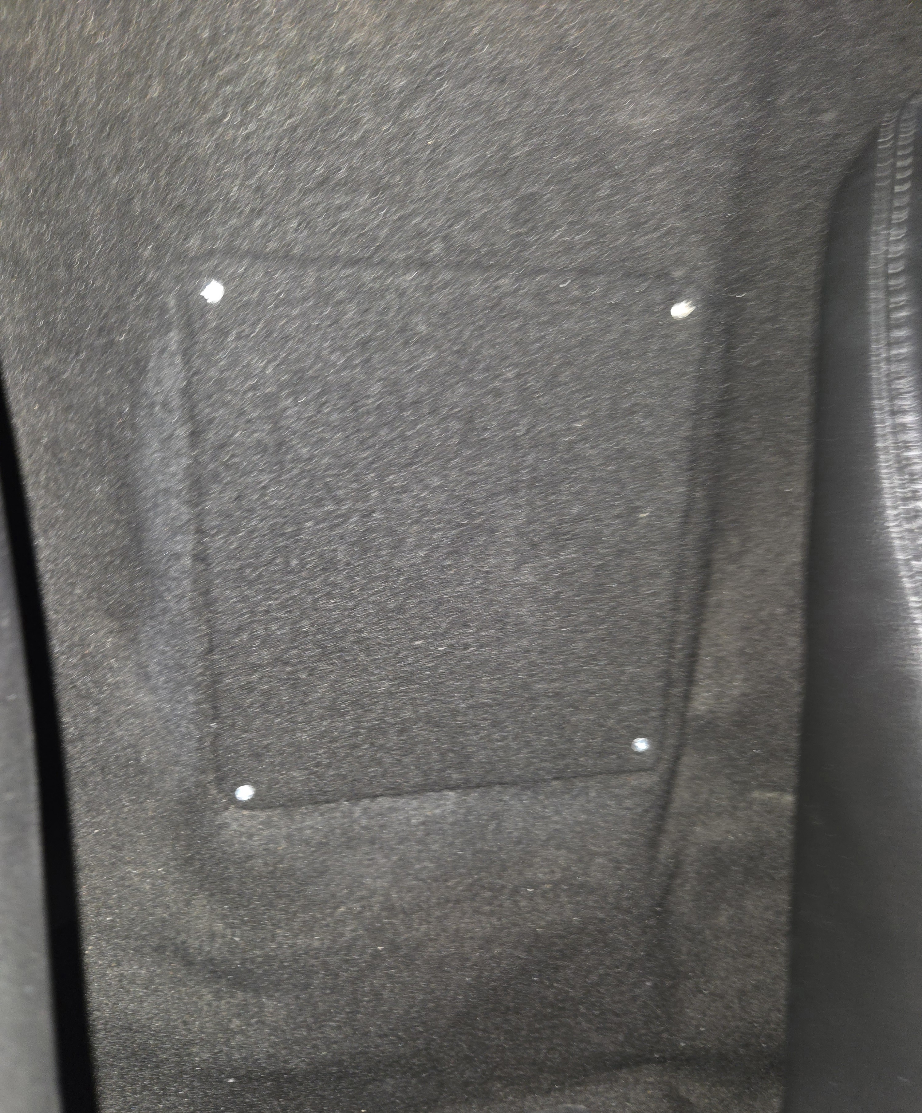 This picture shows the basic layout, dark gray felt material, and the 4) sheet metal screws holding the metal plate (8" Height / 7½" Width) in place. Your firewall cutout should be smaller, in order to leave a metal edge where the fasteners will secure to. Your Center Line is established as Center of targa window. The 10½" distance = bottom of where the window sits on the metal 'Step of interior bodywork>> to the Top of metal plate location...next diagram. |