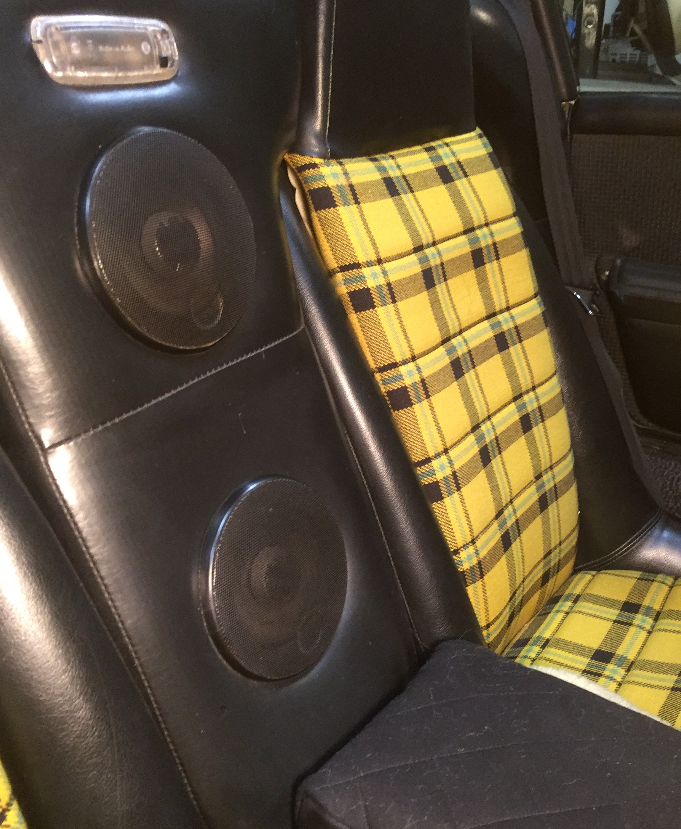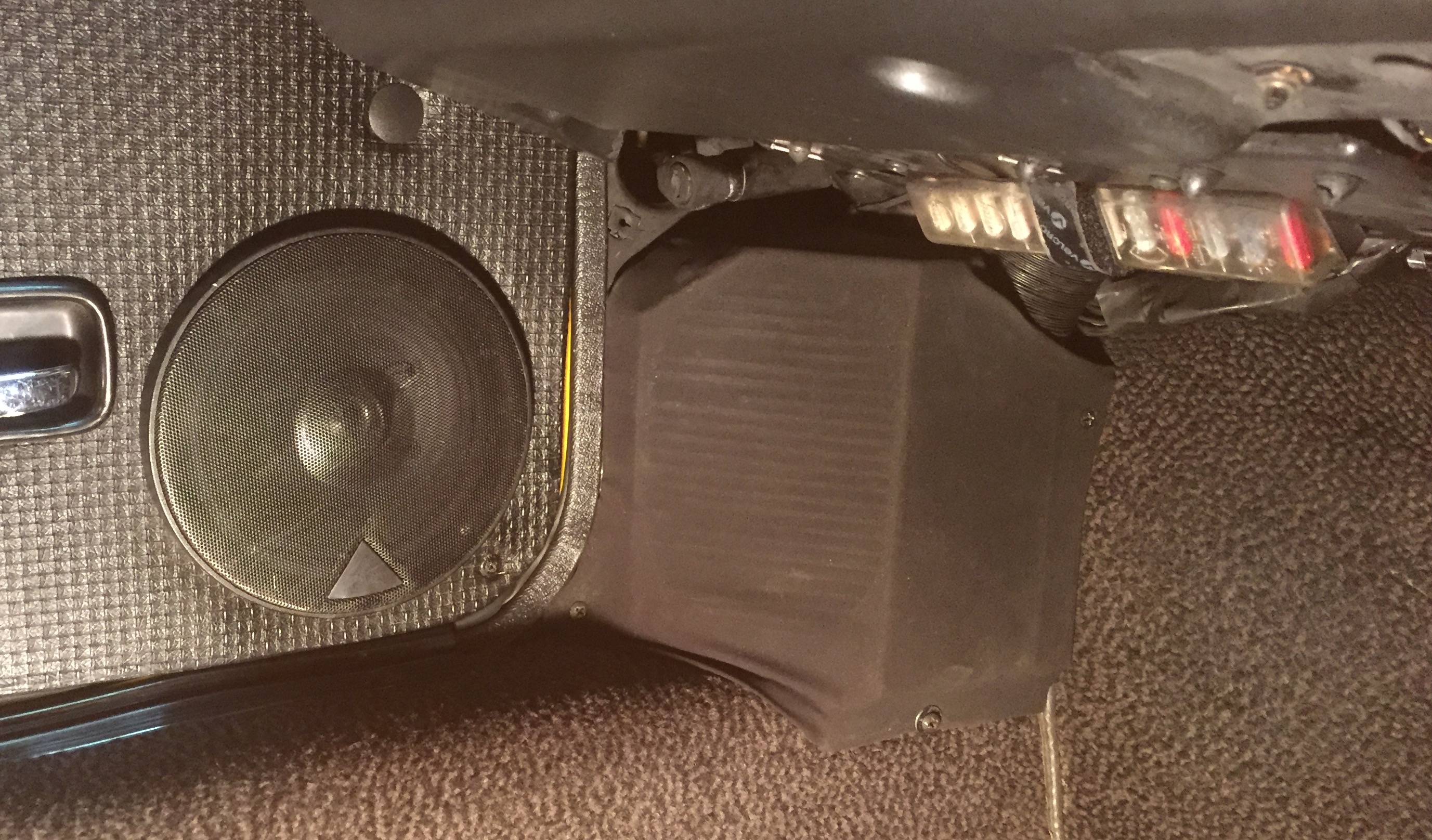 I have two speakers on each side in front, one in the original footwell location and one in the door, wired together in series as one channel. Each pair make up the front left channel on one side and the front right channel on the other side. Then I have two speakers in the center of the backrest. One is the left rear channel and one is the right rear channel. When I balance the music out from front to back, it's really easy to hear the sound because it's coming from very close to your ears in the backrest. The front two speakers on each side compensate for their inferior position by being paired for each front channel. Don't need an amplifier. Works better than I could have hoped! (Might also notice the velcro strap around the fuse cover to keep it from being bumped off accidently)