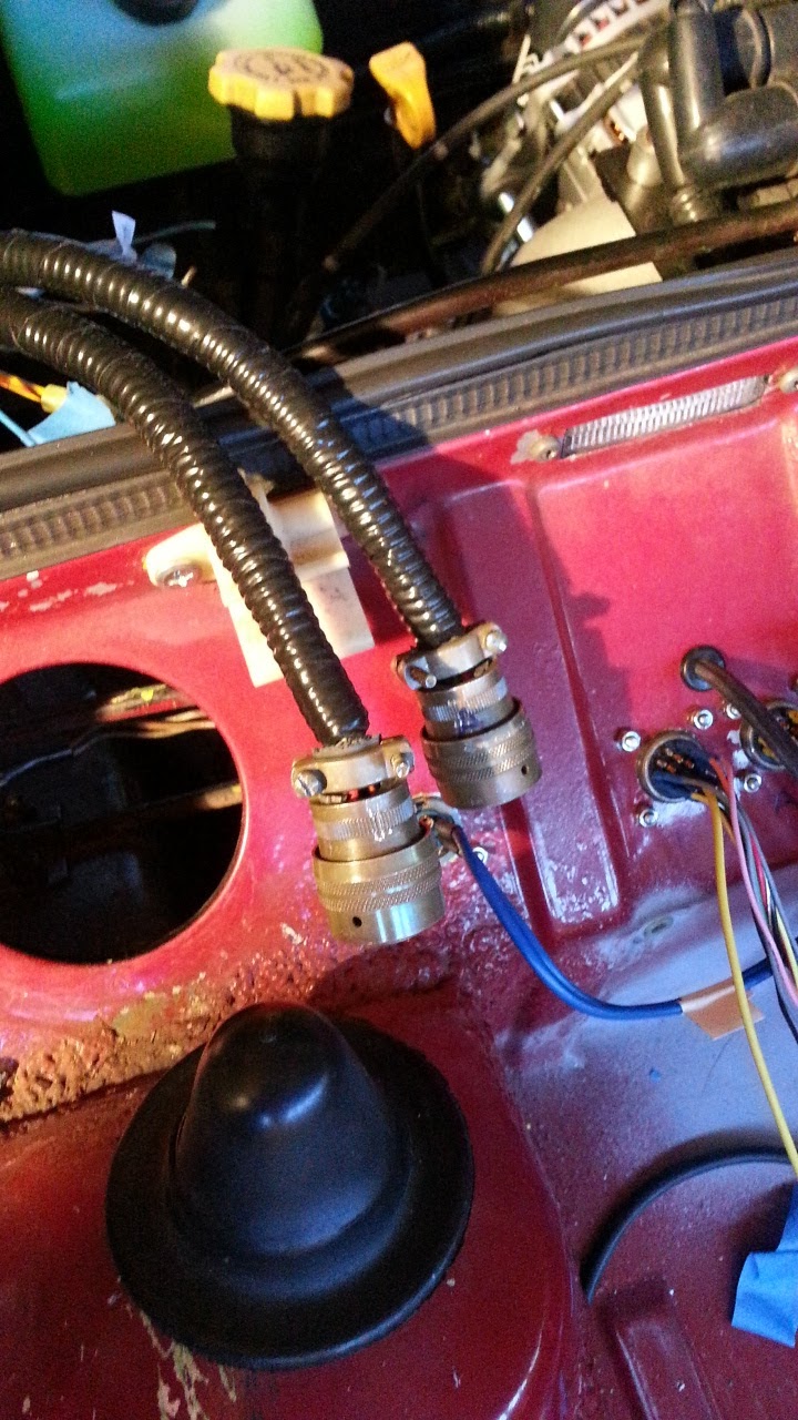 This weekend I tackled another item on the 914 "to do" list. I worked on getting my ECU mounted and the associated wiring sorted. When I decided to mount the ECU in the rear trunk, I wanted to be able to drop the engine without fishing a bunch of wire out of the trunk. The only solution that I could come up with was to connect the ECU to the engine with cannon plugs. So that is was I did. With the twist of 3 cannon plugs the engine is completely disconnected and ready to drop.