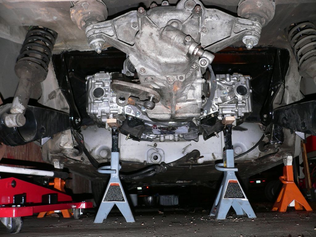 Here's the engine/transmission from beneath. You may notice that the oil pan is missing. That is currently undergoing a geometry adjustment. (making it shorter ro I can keep the engine low.