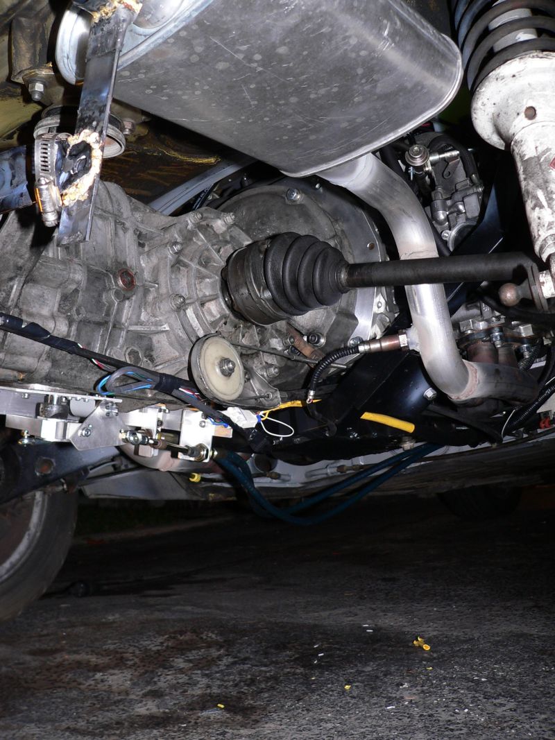 In other news I drove the car for the first time today!!!!! First drive was with no mufflers and was insanely loud. So I decided to clamp the mufflers on temporarily and that helped a lot. Still a lot of leaking exhaust, so its rather loud. So initial impressions after driving. 1. LOUD - exhaust will fix this 2. Shifter is backwards! 1st is Rev. 2nd is 3rd, 4th is 5th. The pivot point for the side-side movement is on the wrong side. This is a simple fix, just relocate the bearing and flip over the linkage. 3. Side-side movement is touchy. The range of motion on the shifter is small. I think I need to lengthen or shorten a lever arm somewhere. 4. Getting into 1st is hard. I'm not sure if this is a function of the shifter mechanism or the transmission. At this point its hard to tell. The transmission has been sitting for some time and I don't know its condition other than what I was told (that it was in really good shape). There was no grinding from bad synchros etc., but this is definitely something to investigate. 5. The battery was dead. Also I'm not sure if the alternator is charging. The battery voltage doesn't go up to 13.8 when running, but that could be because the optima is sucking down amps, loading the alternator. 6. Even without an O2 sensor, and my sensor simulator box out of commision (meaning that the engine is in limp mode) the motor pulls hard. I never got to more than 1/3 or maybe 1/2 due to noise concerns. I'm excited to see how this thing will run with everything hooked up properly. Tomorrow I'm going to try to get my muffler bracket made. First though I want to work on the shifter and see if I can get it shifting better. I don't want to hand over the car to the muffler shop without it shifting well. If all goes well I will take it in to the shop Monday or Tuesday. -Tony |