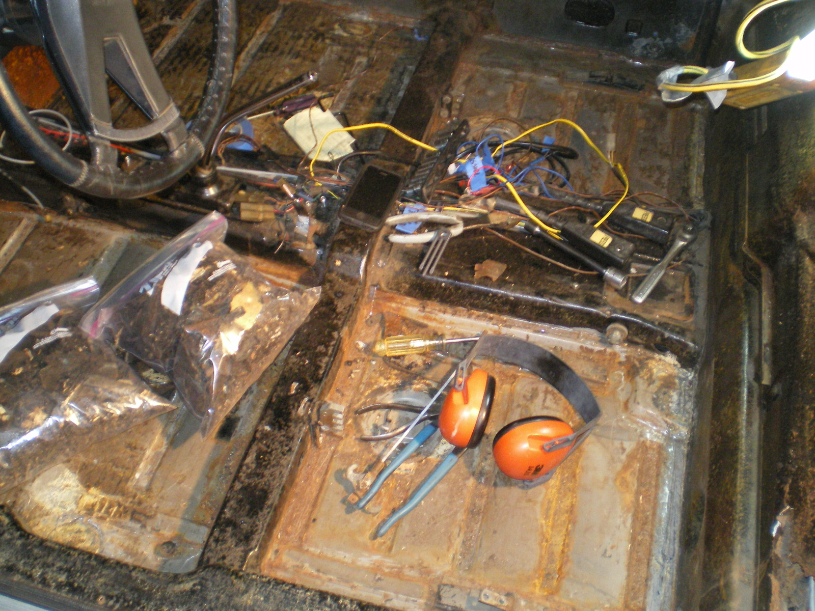 So after a couple of hours this is what I found beneath the tar. (IMG:style_emoticons/default/biggrin.gif) A little surface rust that should brush off with a cup brush. I did not skin the tunnel as it is above any suspect areas and I have looked inside the tunnel before with a camera. The two floorboards together yielded 9.8 lb's of tar.