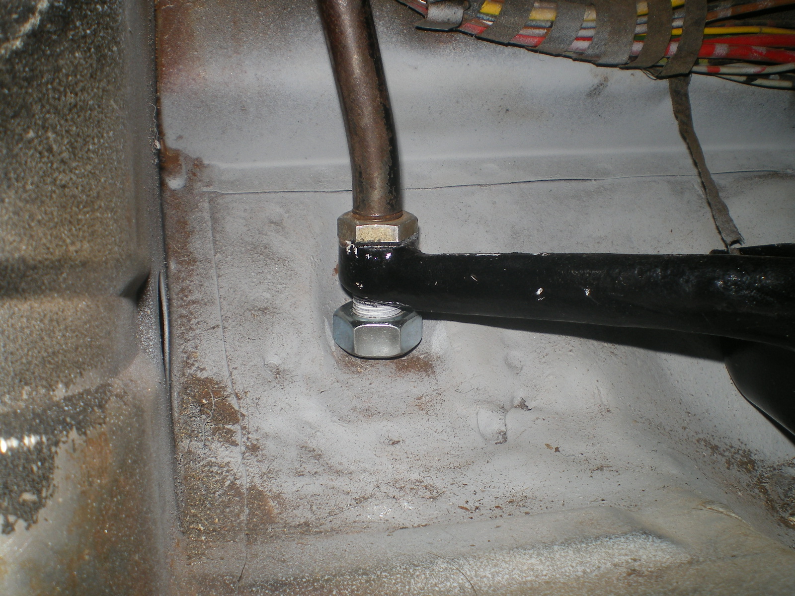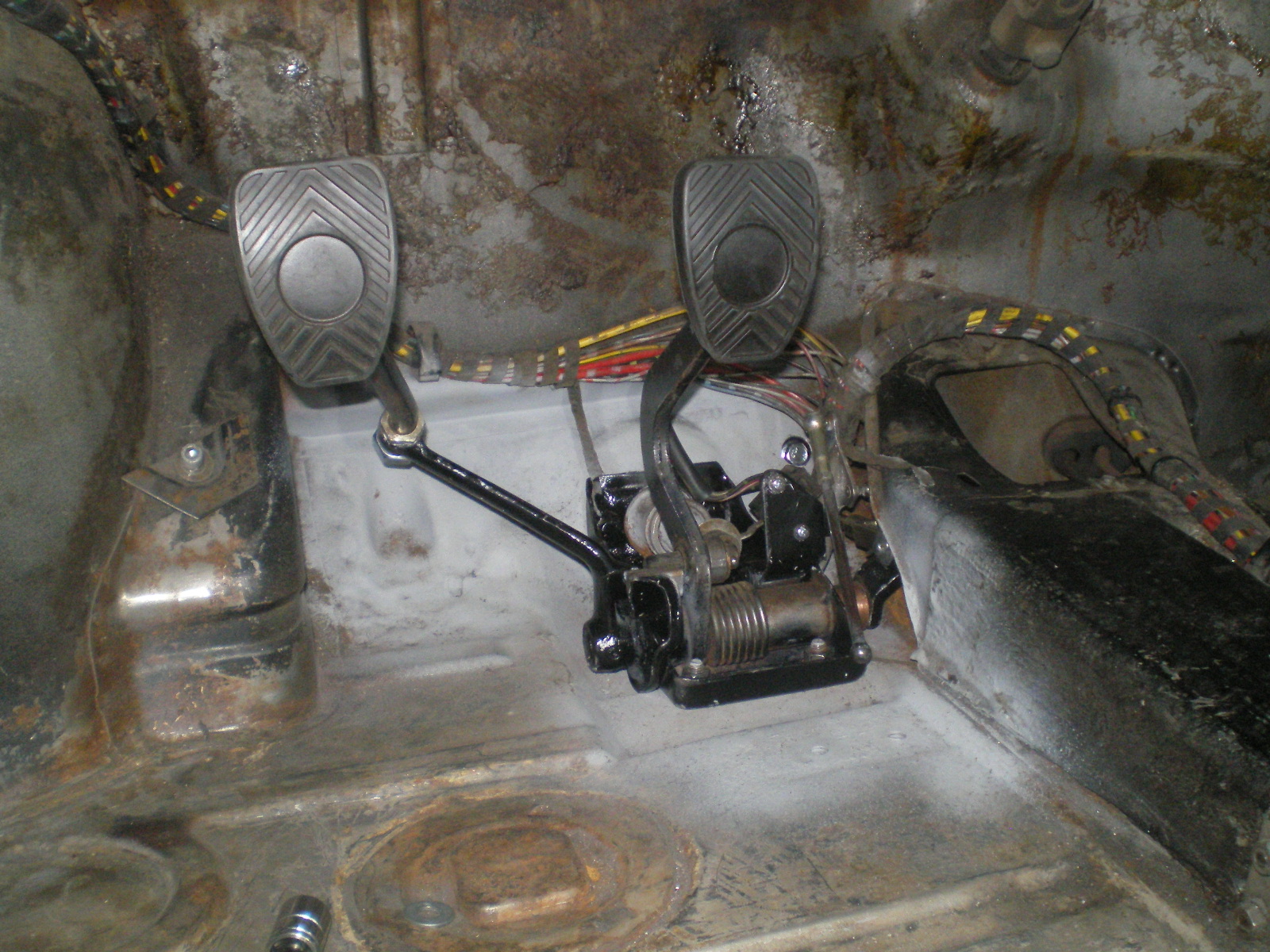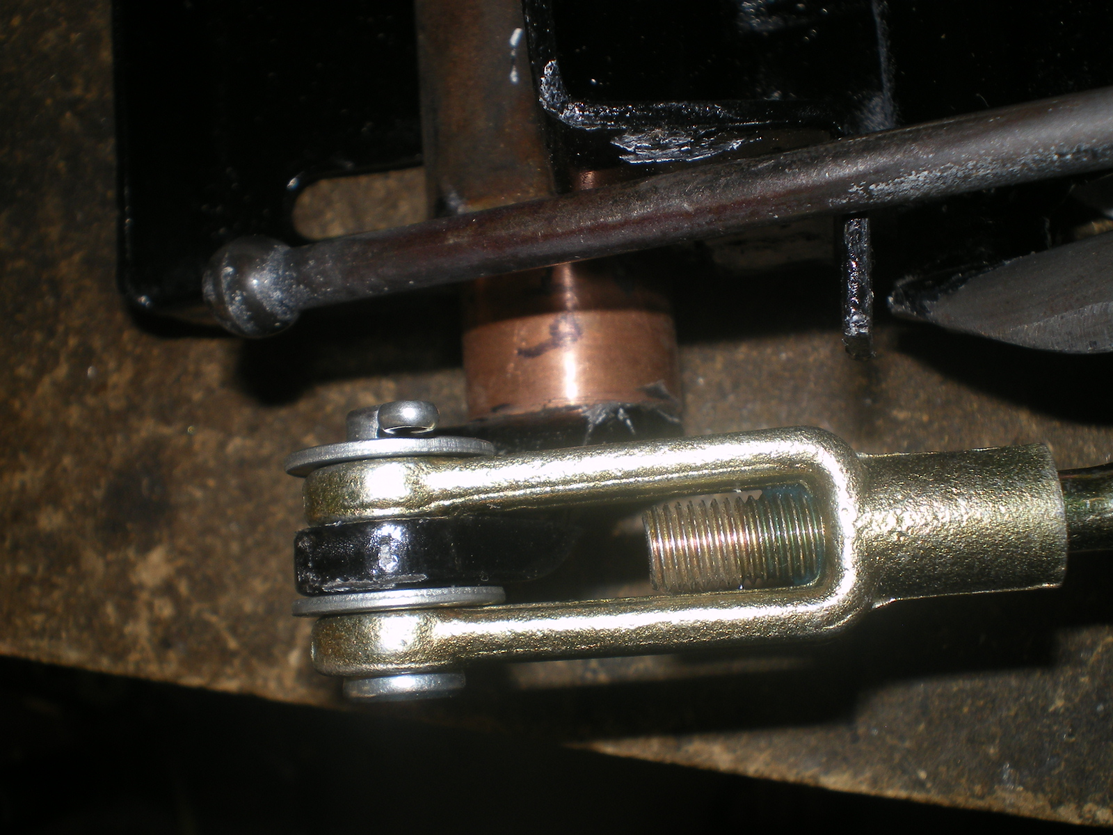Loosen the jam nut then screw the pedal arm into it's receiver as far as it will go. Now check your travel. It should be 1" now. If not, adjust accordingly. Then tighten the jam nut, tightly. Now add a nut to the bottom (as shown in pic) with locktite. You could spot weld it but you may want to remove it one day.This will add some area to the end which will be stop. The floor board has an indentation that will accept this "foot" perfectly. It's hard to see in the pic's but it's there. Disregard this conglomeration on the end of the pedal shaft. I discovered later that it was not needed, only one 14mm x 1.5 nut. Up postion Down and seated This pic shows the clevis connection (you should have about 8mm of threads protruding from the clevis. Note the washer inside the clevis. This was done to fill the void and to throw the rod a bit to the side for clearance. I trimmed the throttle piece (and IIRC so did pcar) which gives me a clean 8mm separation between clutch and throttle linkages. Notice the 19mm spacer in place of the return spring. And some trimming of the throttle linkage ![]() |