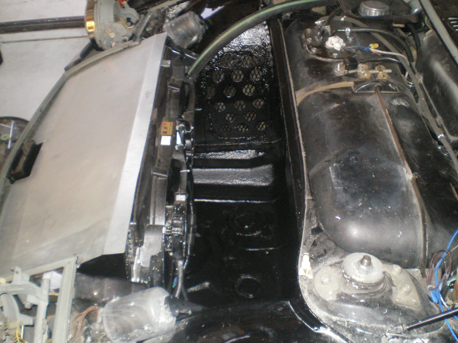 Rather than all the 'up/down/up/down' would it be better to go through and under the fuel tank, then across to the longs? I'm planning this out right now too. Was thinking of welding up a tube to the frame so in not worried about a soft/hot hose in the cabin. After re-reading your post Doug I don't think you should worry. Those "soft hot hoes in the cabin" pose no threat unless your wife were to intervene. (IMG:style_emoticons/default/shades.gif) Back to work............. take a look at this fender. 41 yr old paint. ![]() !0 min's on each fender with a foam polishing disc (left over HF Lens Polishing Kit) some 3M compound ![]() ![]() I dug out the sand blaster and hit the front sway bar pieces (thx Garold S) and hit these 2 pieces while I was at it. Primed and painted. Ready for install. ![]() And as long as I was getting paint on myself I applied the Bed Liner to the front radiator area. I wanted something more than paint in this area and it was free. ![]() ![]() ![]() ![]() ![]() It was necessary to trim the pan a tad. I may or may not make a clam shell cover. The 4 body bolts keep it very steady but................. |