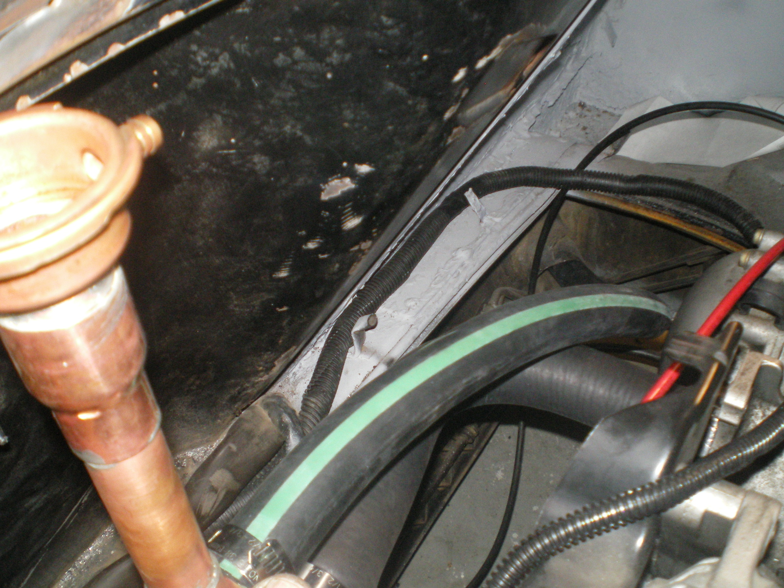 ![]() ![]() I wondered if the hose had just flattened down and allowed the hood to close so I laid this putty about and took a few measurements here and there. And sure enough... see the flat spots in the putty and the corresponding witness mark on the hood. ![]() ![]() ![]() This seemed to be the best location to cut because it was between the tank and shock tower. ![]() a patch piece ![]() ![]() ![]() primed and ready to be welded in ![]() ![]() |