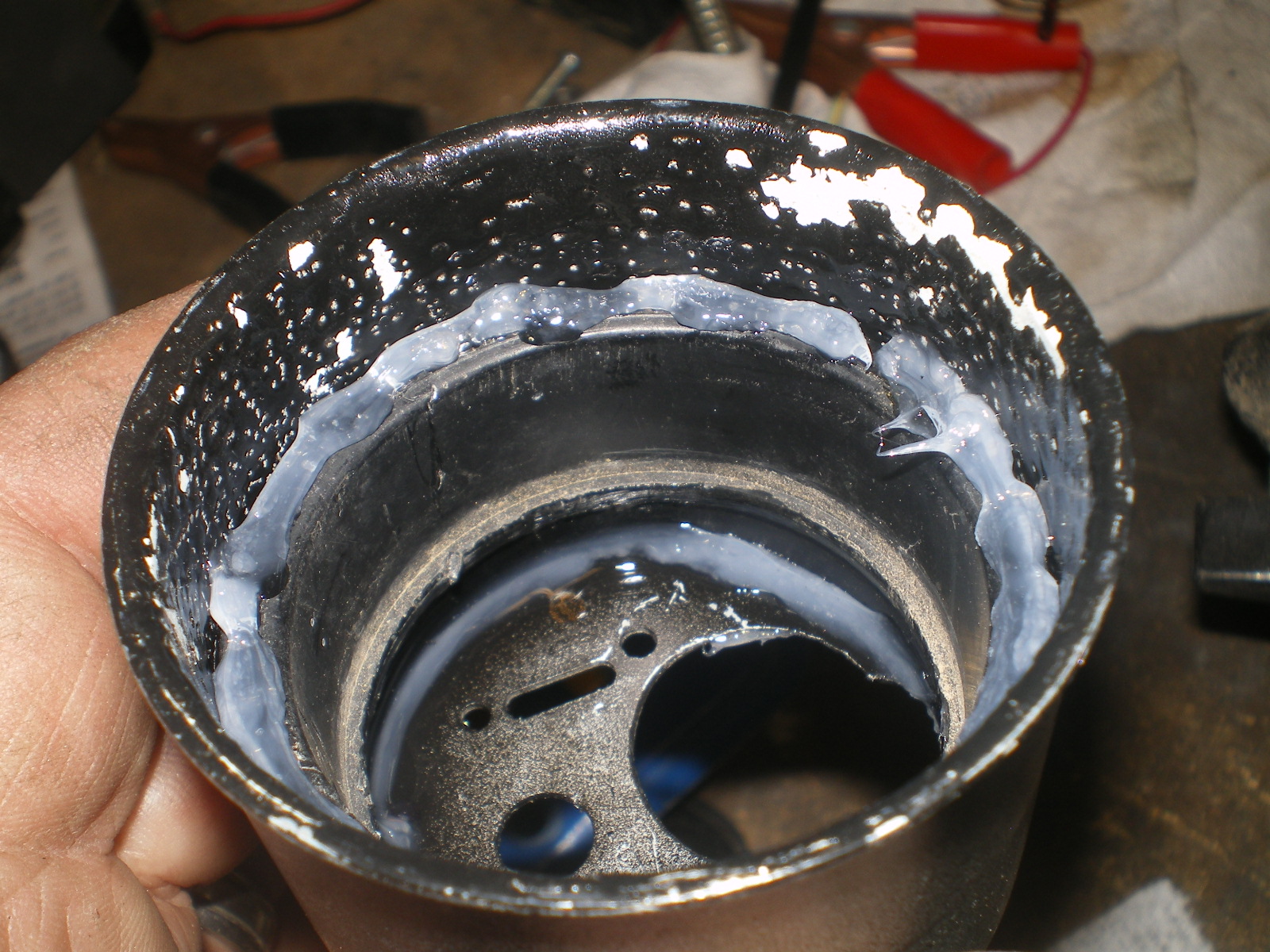 I read where Toolguy uses a hose clamp around the bezel before prying it off to keep it from stretching and getting beaten to (IMG:style_emoticons/default/stromberg.gif) . My hose clamp was kind of beefy and I didn't trust it would conform so I took this short piece of 2.5" copper and cut a slit in it. The diameter was 1mm too small to slip over the bezel. ![]() Then I placed the gage so the bezel was flush with the edge of the copper sleeve and tightened a hose clamp around the copper to lightly compress the bezel. ![]() Here it is from the south end. ![]() Then work a small flat blade screw driver around about 80% of the circle and remove the bezel and glass. ![]() ![]() Next remove the 3 screws from the back, clip the solder joint off and the clock will fall out. ![]() ![]() Clamp the gage to the can and mark for first cut with a scroll ![]() ![]() A quick test fit ![]() These are the pins that are attached to the circuit board which this gage was originally attached to. I pulled them out of the circuit board with pliers then put them in the vise and hit them with heat and a blast of compressed air to blow out the solder joint. It leaves a neat little pattern where the solder blows. The 3 posts soldered with leads in and ready to place in the can ![]() I haven't closed the bezel as I need to locate a glass cover w/o the hole in the center. And the silicone holding the gage in place isn't dry but other than that I think this one is done. ![]() Attached image(s)