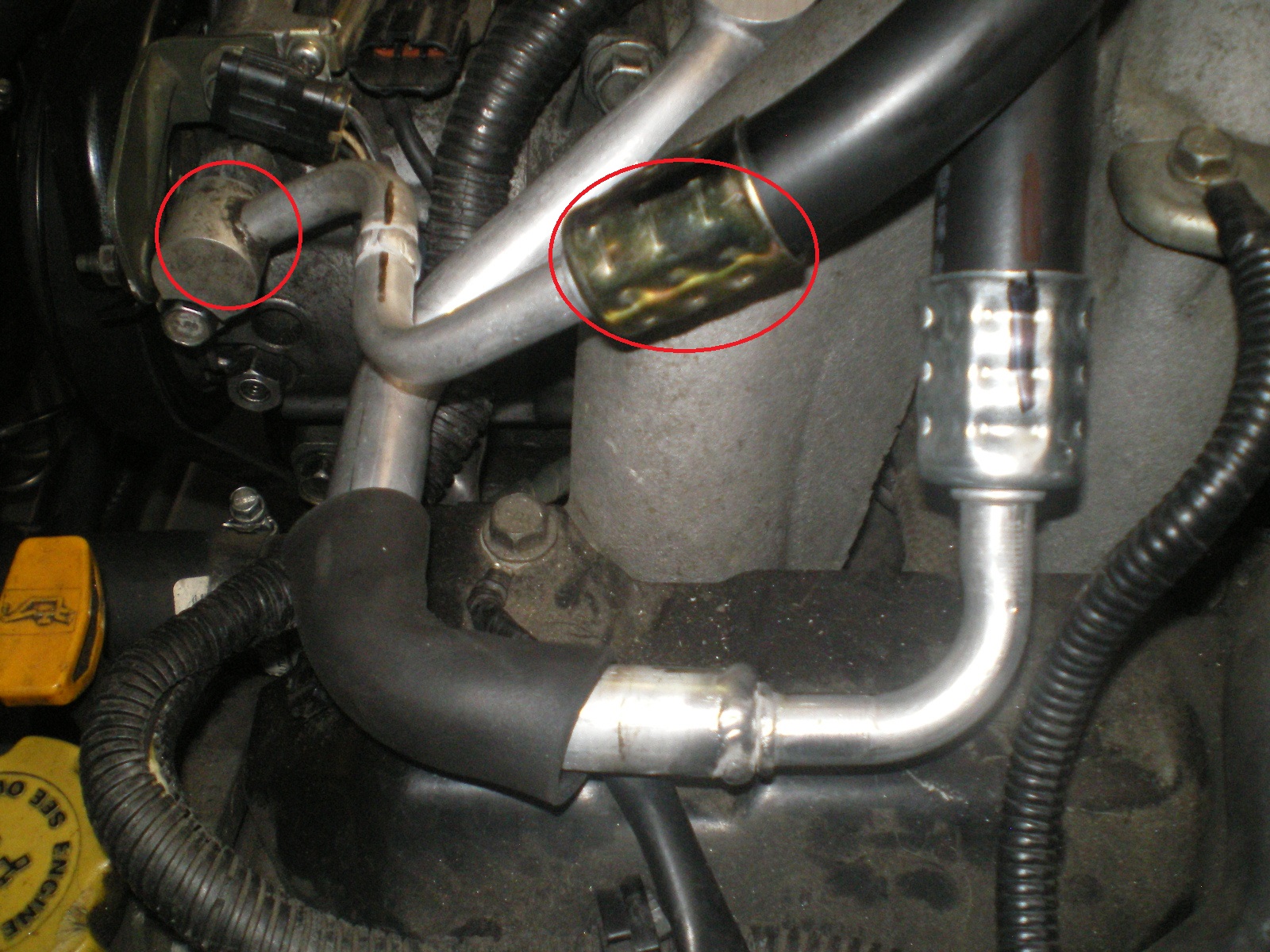 Hardly noteworthy but glad it is holding. As I mentioned earlier; I don't know (IMG:style_emoticons/default/stromberg.gif) from Apple Butter about AC but I'm learning. I could pull it down but it would leak down almost immediately. I put some dye down the hose before tapping into the Freon can and there it was staring me in the face. The O-ring on the OEM fitting (circled in red) at the compressor was hard as a rock. Missed that (IMG:style_emoticons/default/slap.gif) . The other leak was on the "New" crimp fitting (circled in red as well). Do you see the error? I didn't either until now. Look at the ferrule. Notice the indentations from the crimp aren't as pronounced as the fitting to the right of it? Yep, I crimped a #8 fitting with #10 dies. (IMG:style_emoticons/default/headbang.gif)