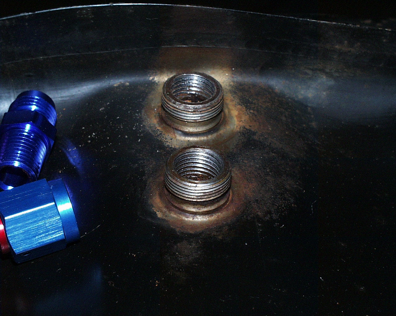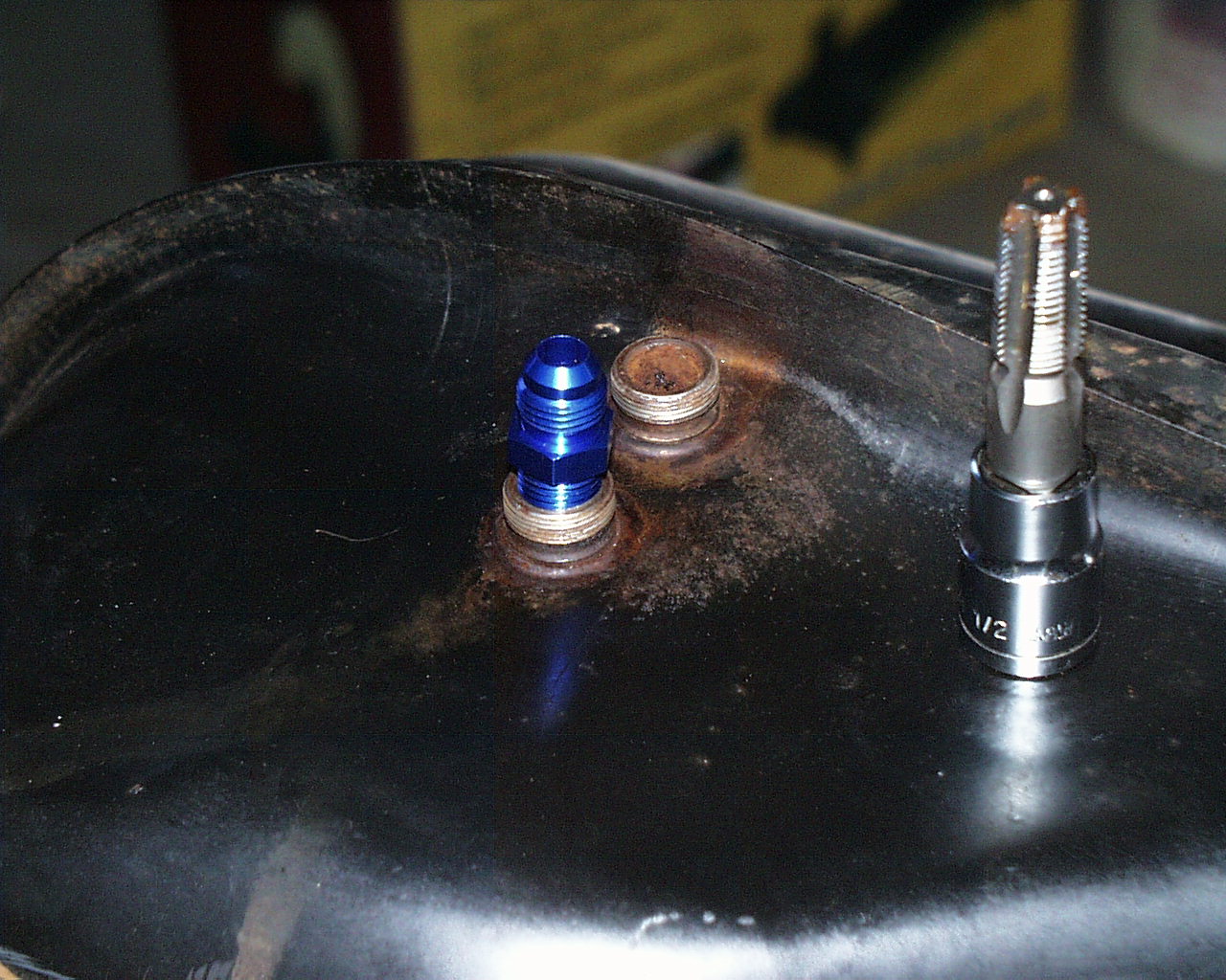 The id. of the stock fittings is a little larger than 7/16", I didn't measure the exact size. I think the threads that are cut will be fine, they are just a little deeper on the tap so the fitting screws in a little bit more, but far from bottoming out. The final test will be to put some fitting on with caps, fill the tank and see if it leaks before putting it in the car. Attached thumbnail(s) |