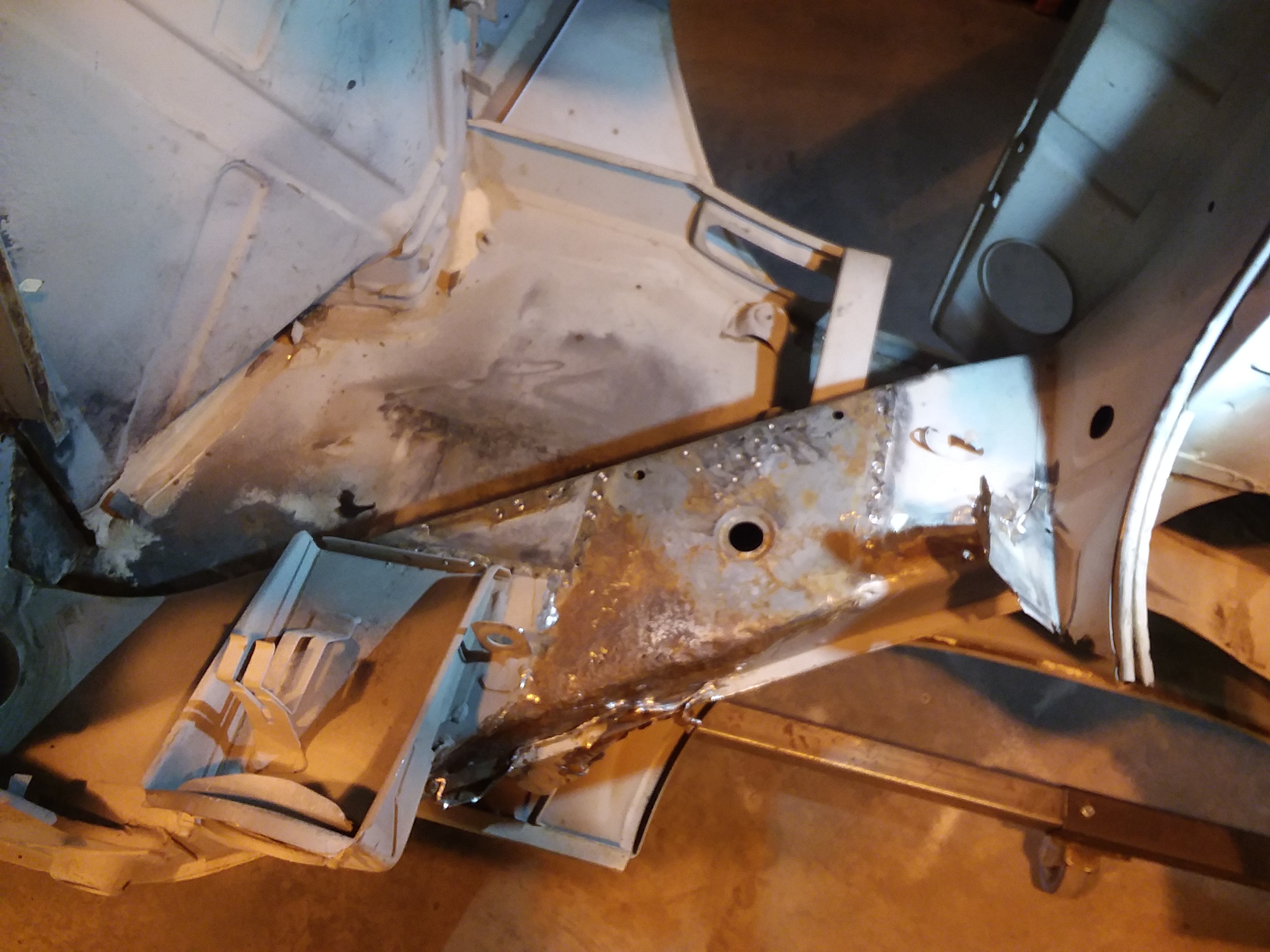 ![]() pretty significant whack.................. ![]() ![]() But after all the geometry, it looks to be 2-3 mm both back and to the right. Which is just a smidgen out of tolerance. So back to work ............... First order of business. I'll fix the split in the tire well. ![]() ![]() Needs a little more hammer and dolly work when I have a second set of hands. Blasted the cross member and gave it a couple coats of cold galvanizing. ![]() After just a smidgen of tuning and she slipped into place. Next onto welding in the right rear cross member mount. ![]() |
