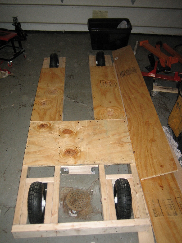 So, while jacking the ass end of the bus, the thing shifted and fell to the side opposite of me. There is still a bit of a hill and it is now soft grassy ground. I seem to have this under control now with the ass end up about 18", but I need a way to get my engine out from under the bus once I drop it. I designed a dolly with 10" pneumatic tires that will allow me to lower the engine and drive train down on top of it and roll the whole package out from under the bus. I got about 1/3 of it done tonight in my basement (not cold! (IMG:style_emoticons/default/smilie_pokal.gif) ) and will hopefully have it done and used tomorrow.