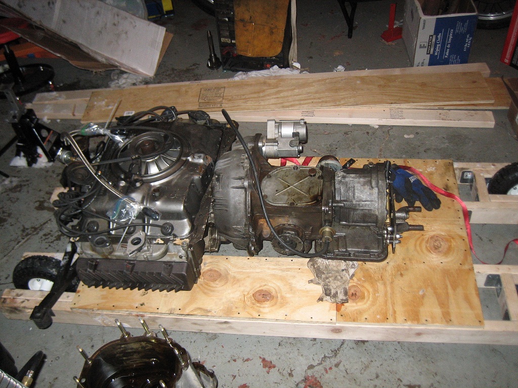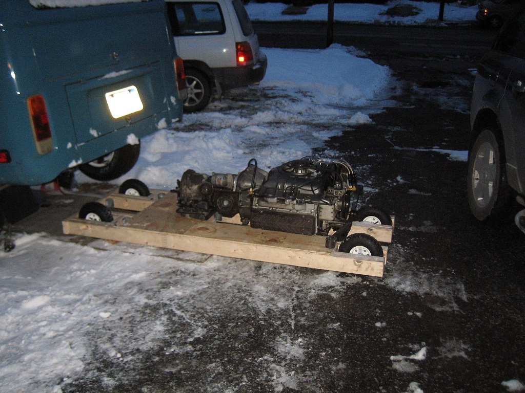 FINALLY! I got to use my contraption and got the engine out pretty easily. Kind of hairy once the cradle was pointed down hill in order to get it into the garage. No much traction on a painted floor wet with snow (IMG:style_emoticons/default/dry.gif)