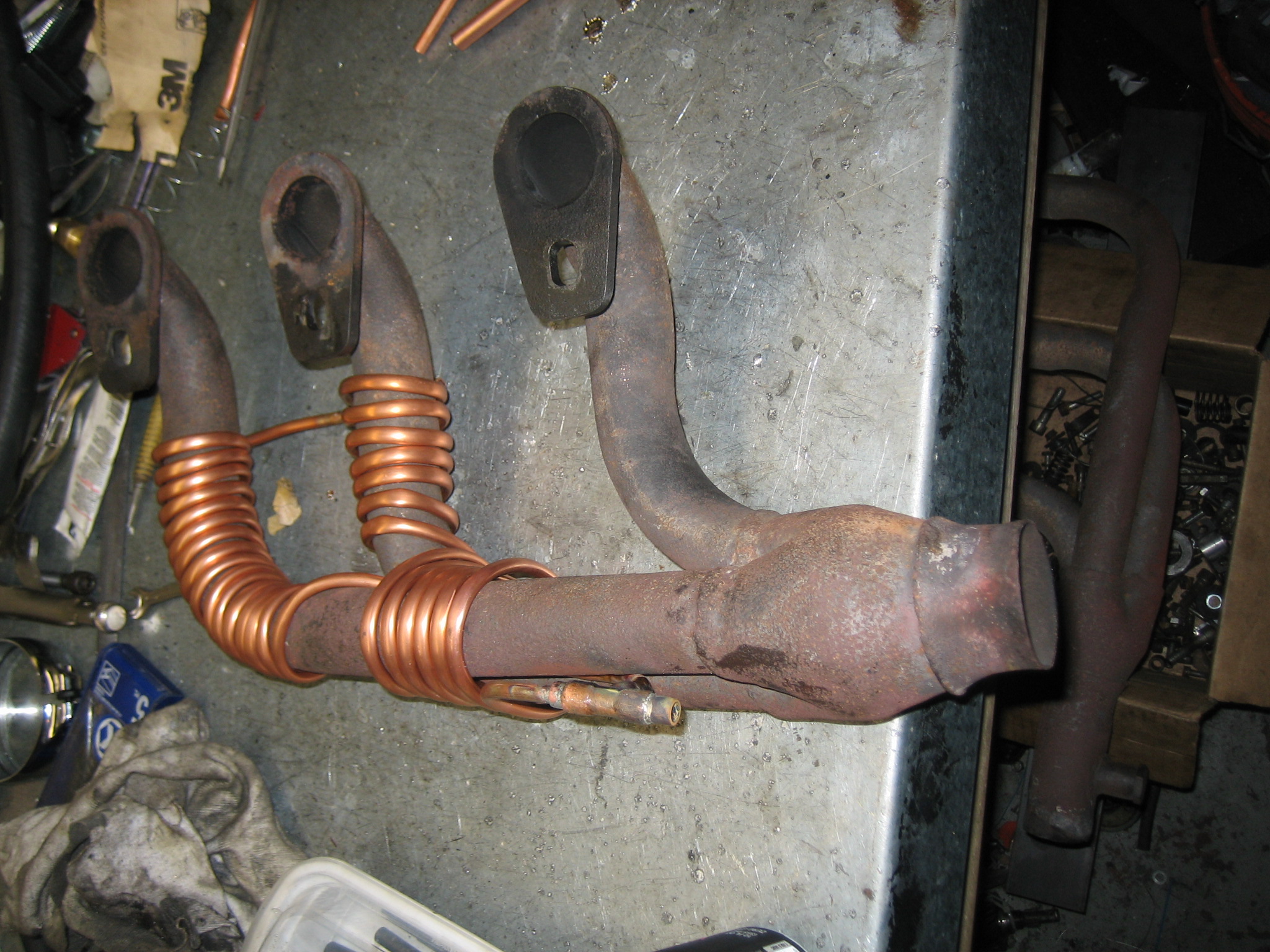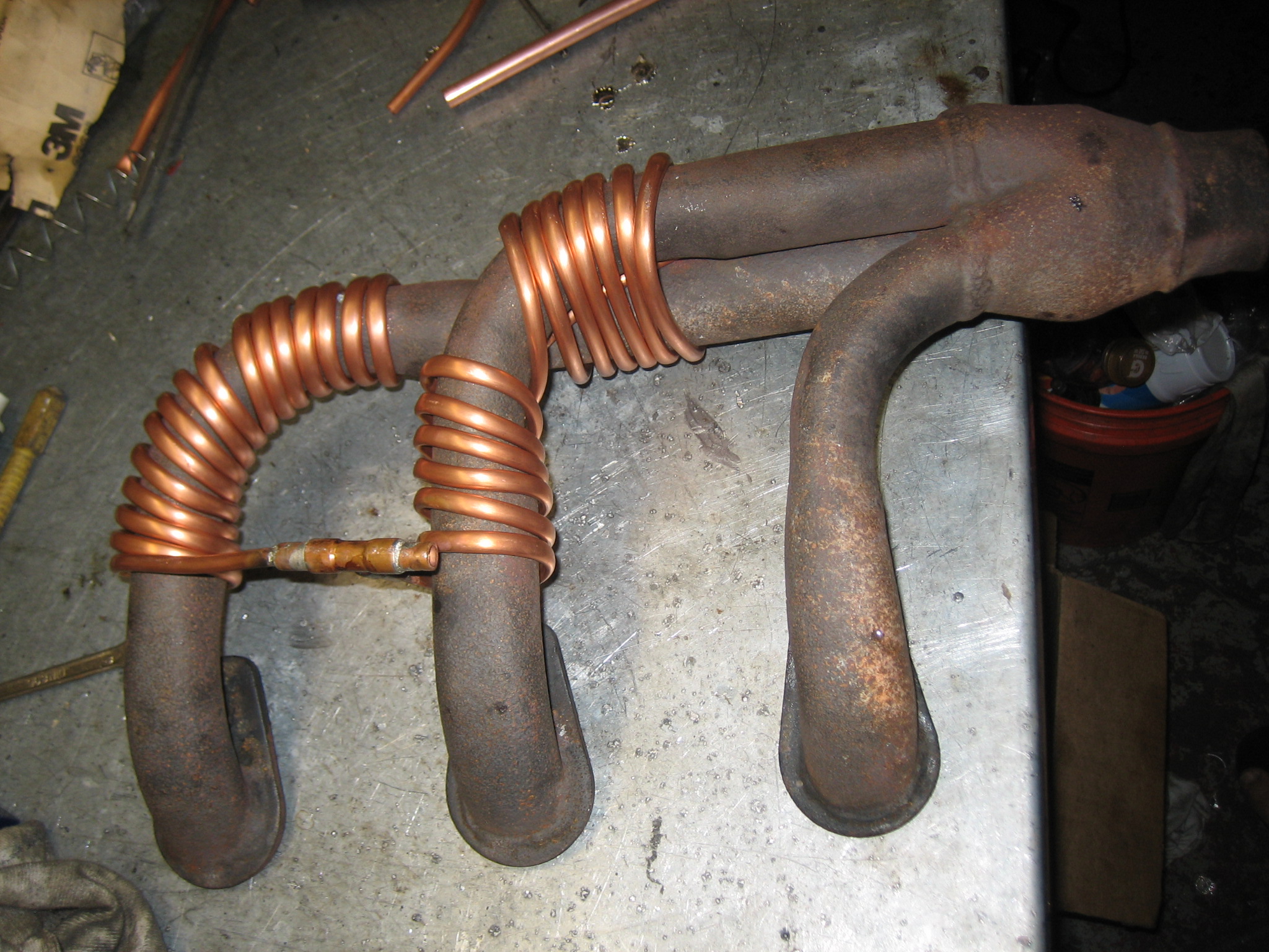 This is not done yet.... I plan to wrap the whole works in header tape to both keep the heat in and to keep the meth addicts from stealing the copper (IMG:style_emoticons/default/dry.gif) I just spent a couple of hours looking for an M14x1.5 tap for the thermotime switch for the FI system. I OK, header tape makes sense as a way to help hold the copper in place as well as holding the heat in. The copper pipe will expand at a greater rate than the steel pipe and the copper pipe is "long" so it may expand and lift off a bit as things warm up. Try a quick and dirty "warm-up" test on a section of the coiled copper with a hot air gun or propane tourch to see what happens. Like the idea of the header tape to act as a "sleeve" to keep the heat in. Hey, I thought the internet searching was supposed to speed things up? |
