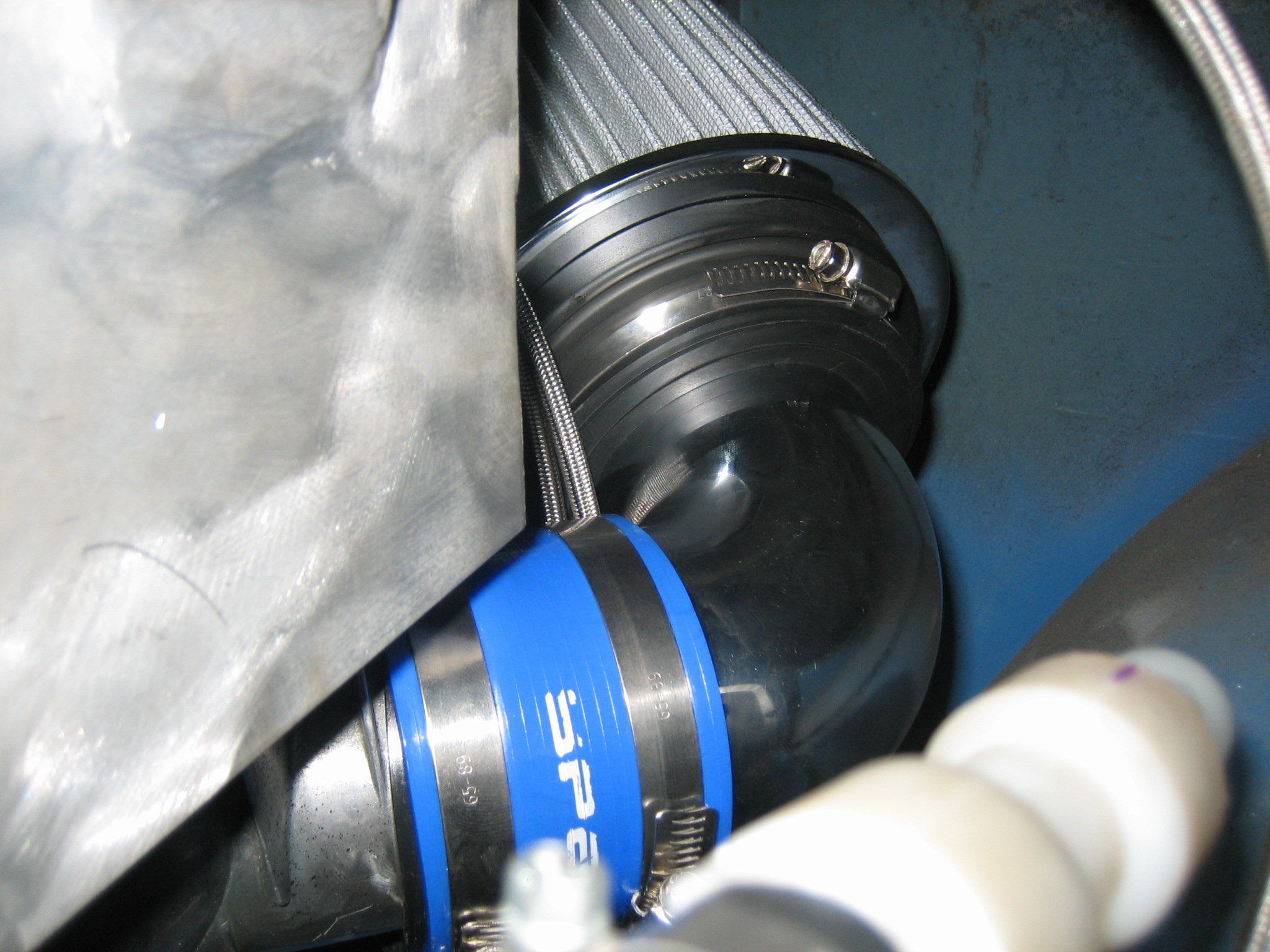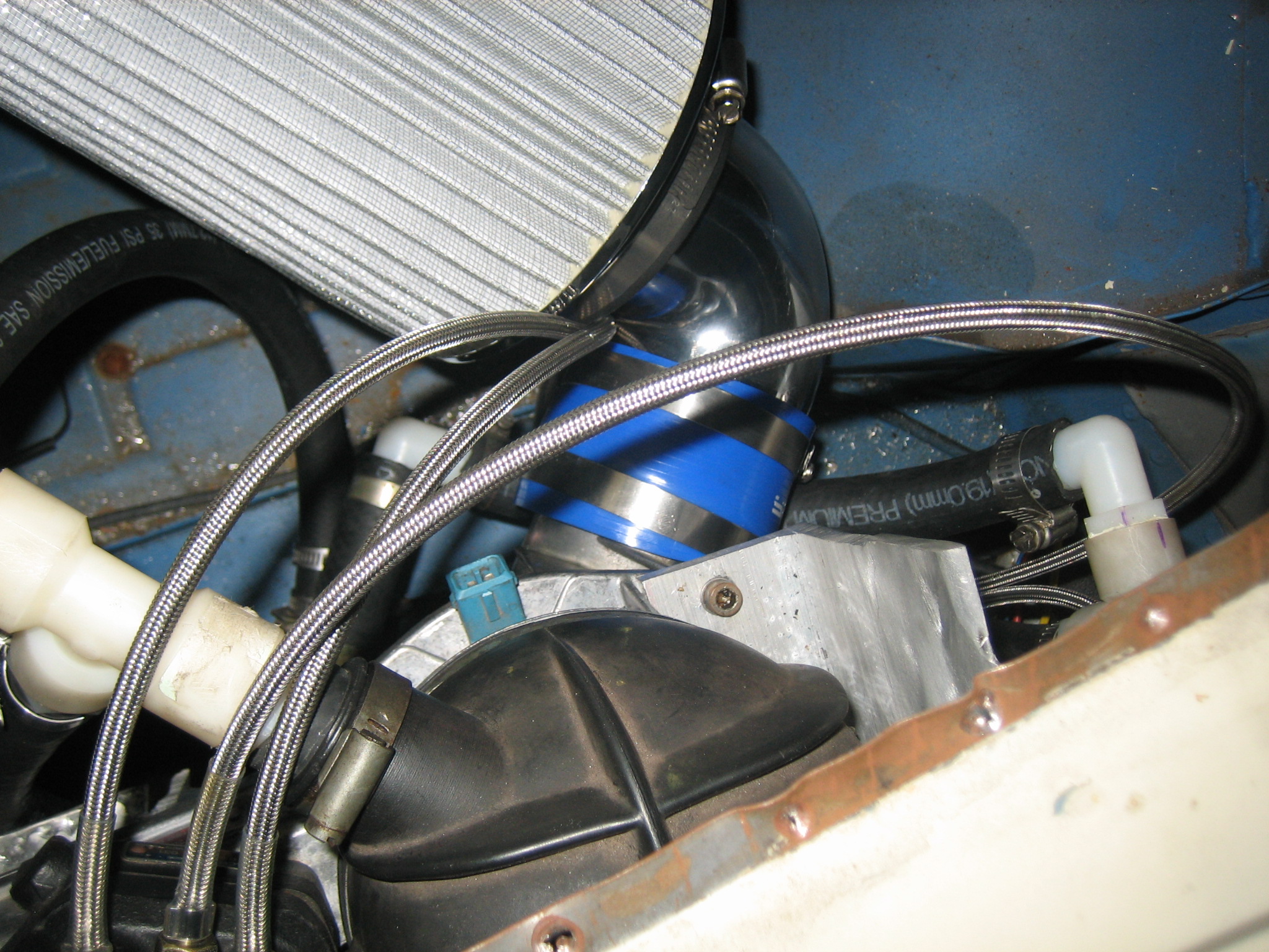 Did I mention that bad T-storms are rolling through at the same time? So, into the garage to work on stuff. I decided to get the headers rigged with phase one of my next experiment (IMG:style_emoticons/default/happy11.gif) I ran out of tubing so it is not done. I also managed to get a pod filter to fit perfectly into the space on the engine bay. Hard to take pics of. I think I will turn the hole where the spare used to go into another access hatch for filter and FI maintenance. |